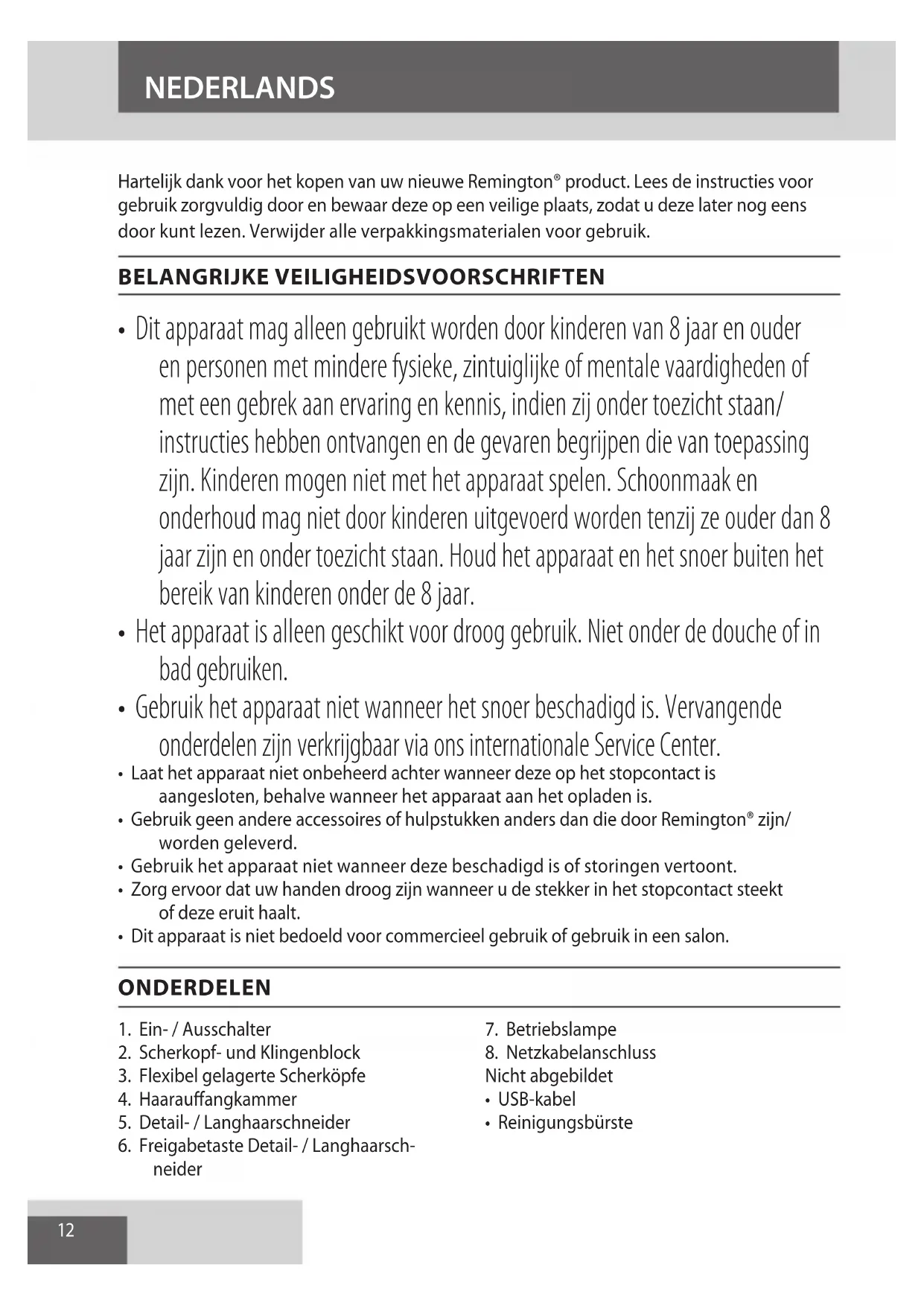 - Gebruik geen andere accessoires of hulpstukken anders dan die door Remington® zijn/ worden geleverd.