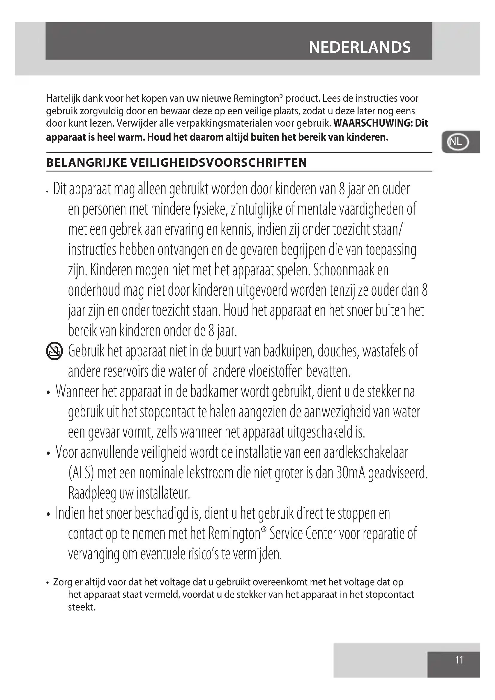 - Indien het snoer beschadigd is, dient u het gebruik direct te stoppen en contact op te nemen met het Remington® Service Center voor reparatie of vervanging om eventuele risico’s te vermijden.