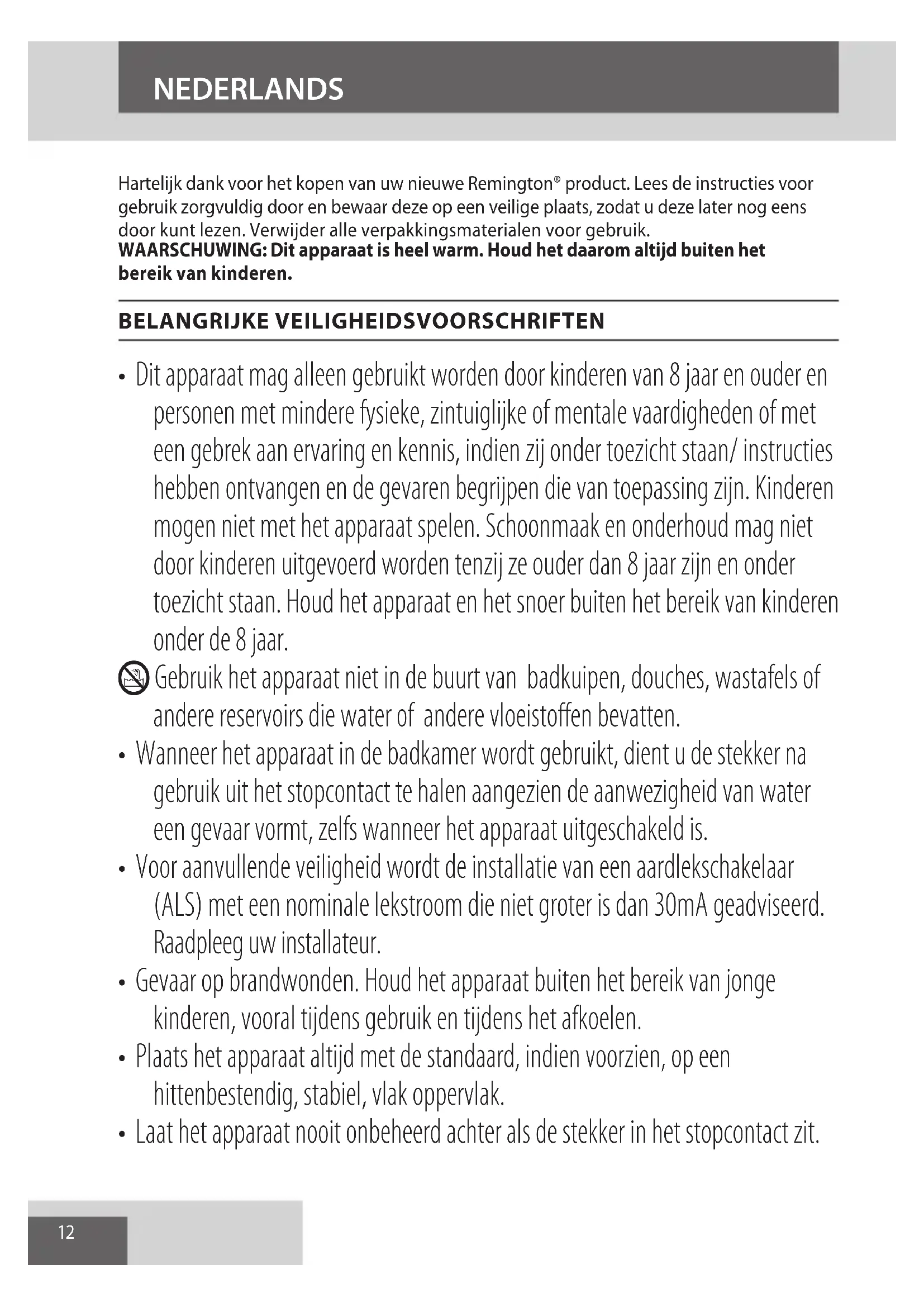AE12 Hartelijk dank voor het kopen van uw nieuwe Remington® product. Lees de instructies voor gebruik zorgvuldig door en bewaar deze op een veilige plaats, zodat u deze later nog eens door kunt lezen. Verwijder alle verpakkingsmaterialen voor gebruik. WAARSCHUWING: Dit apparaat is heel warm. Houd het daarom altijd buiten het bereik van kinderen. BELANGRIJKE VEILIGHEIDSVOORSCHRIFTEN