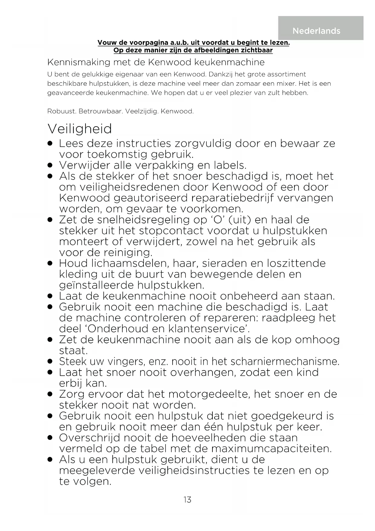 Stand Mixer unplugged. The display screen will turn o automatically if the same weight reading is shown after 5 minutes. Plug appliance in. Press the ON/ZERO button once and the display screen will light up. Display showing [0 – Ld] Weighing function overloaded Excessive force applied to Stand Mixer. Do not exceed the maximum weighing capacity of 6Kg. Do not subject the Stand Mixer to excessive force as this may damage the weighing sensor. 12Kennismaking met de Kenwood keukenmachine U bent de gelukkige eigenaar van een Kenwood. Dankzij het grote assortiment beschikbare hulpstukken, is deze machine veel meer dan zomaar een mixer. Het is een geavanceerde keukenmachine. We hopen dat u er veel plezier van zult hebben. Robuust. Betrouwbaar. Veelzijdig. Kenwood. Nederlands Veiligheid