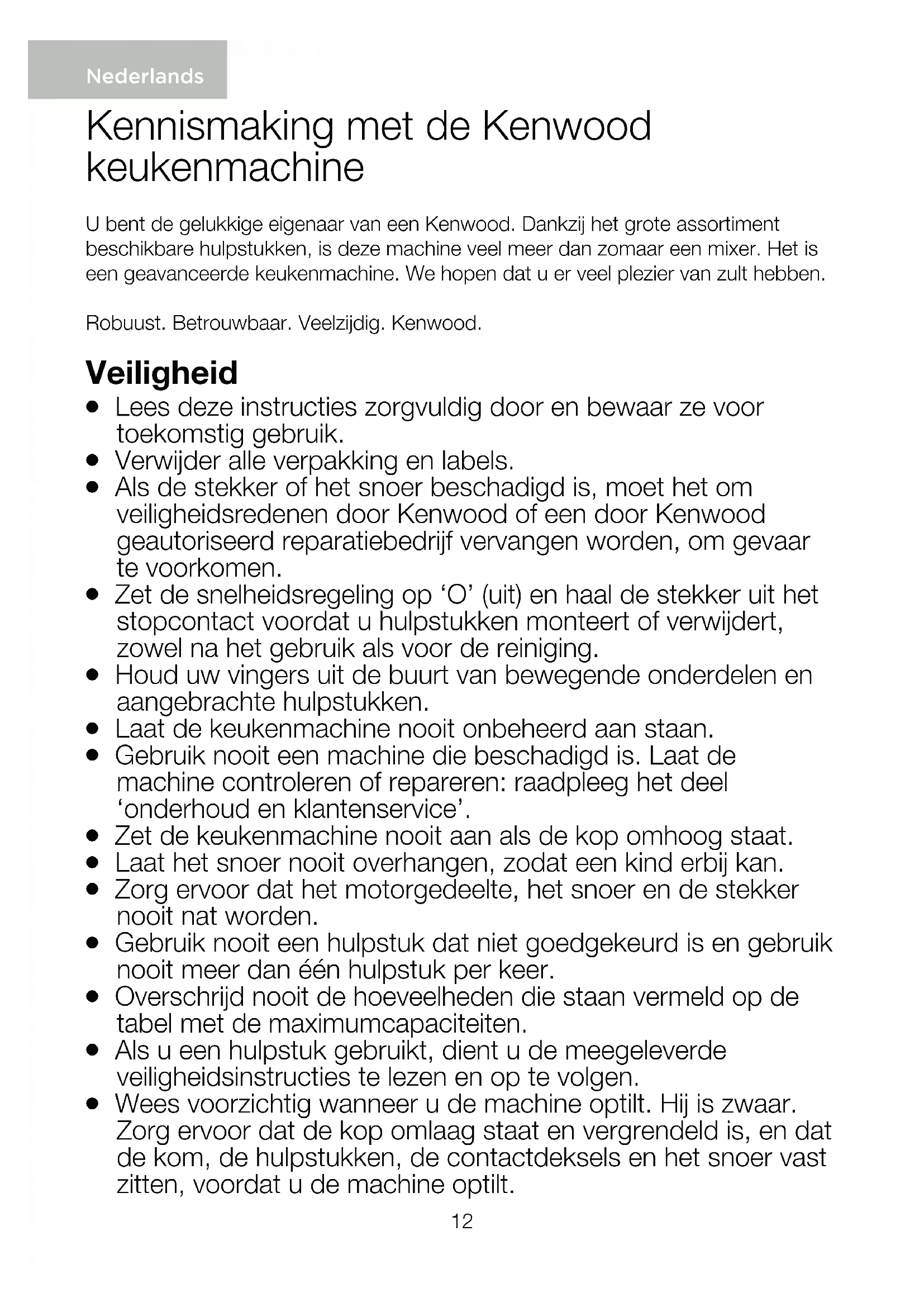 ELEKTRONISCHE APPARATUUR (AEEA) Aan het einde van de levensduur van het product mag het niet samen met het gewone huishoudelijke afval worden verwerkt. Het moet naar een speciaal centrum voor gescheiden afvalinzameling van de gemeente worden gebracht, of naar een verkooppunt dat deze service verschaft. Het apart verwerken van een huishoudelijk apparaat voorkomt mogelijke gevolgen voor het milieu en de gezondheid die door een ongeschikte verwerking ontstaan en zorgt ervoor dat de materialen waaruit het apparaat bestaat, teruggewonnen kunnen worden om een aanmerkelijke besparing van energie en grondstoffen te verkrijgen. Om op de verplichting tot gescheiden verwerking van elektrische huishoudelijke apparatuur te wijzen, is op het product het symbool van een doorgekruiste vuilnisbak aangebracht.23 Découvrez votre robot pâtissier multifonction Kenwood Nous tenons à vous féliciter d’avoir porté votre choix sur un robot Kenwood. Avec un tel éventail d’accessoires, votre robot de cuisine est bien plus qu’un simple robot pâtissier. Vous bénéficiez du robot pâtissier multifonction le plus perfectionné à ce jour. Nous espérons qu’il vous apportera pleine satisfaction. Robuste. Fiable. Polyvalent. Kenwood. Sécurité