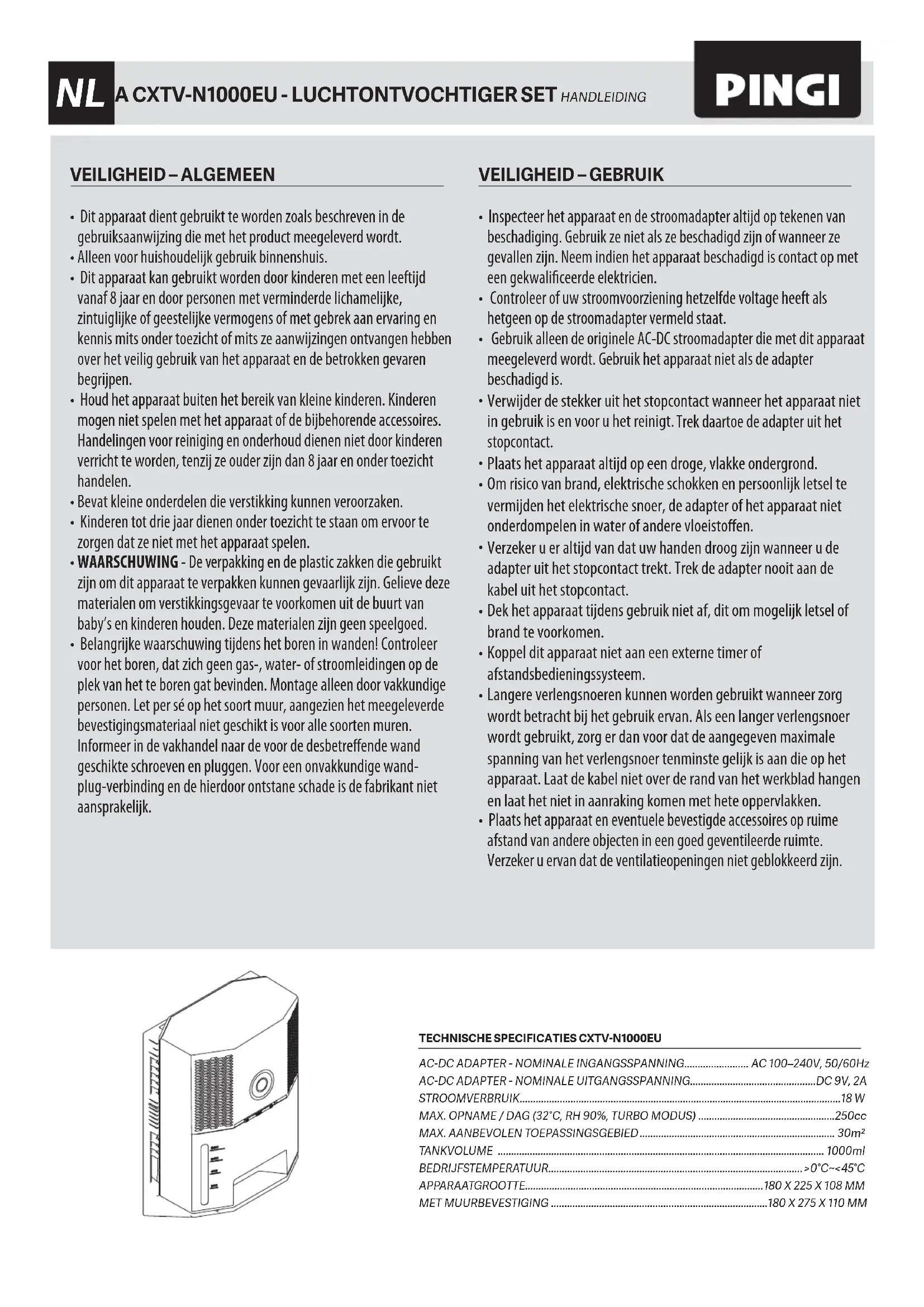 CXTV-N1000EU - VIDA NL (2020)_v1.indd 3 06-11-20(W45) 16:09BEOOGD GEBRUIKUw nieuwe Pingi Vida (CXTV-N1000EU) is geschikt als luchtontvochtiger voor ruimtes binnenshuis. Het apparaat krijgt stroom d.m.v. de meegeleverde 9V AC-DC stroomadapter. De stroomadapter werkt op AC 100-240V AC, 50/60 Hz netspanning. Sluit het apparaat of de adapter nooit op een andere spanningsbron aan. Volg de aanwijzingen in deze handleiding nauwkeurig op en lees de handleiding zorgvuldig door. Bewaar deze instructies op een veilige plaats zodat ze altijd beschikbaar zijn. Dit apparaat voldoet aan de wettelijke nationale en Europese regelgeving. Probeer het apparaat nooit zelf technisch aan te passen. Wij aanvaarden geen aansprakelijkheid voor ongevallen of schades die ontstaan door het niet navolgen van deze gebruikshandleiding.FUNCTIE EN TOEPASSINGDe Pingi Vida luchtontvochtiger (CXTV-N1000EU) is ontwikkeld als compact apparaat om binnenshuis geleidelijk vocht op te nemen. Het apparaat is ideaal voor ruimtes zonder afdoende ventilatie. Het opgevangen vocht wordt verzameld in de uitneembare tank.WAT TE VERWACHTENDe Vida 2 is een thermo-elektrische luchtontvochtiger. De prestaties van dit type ontvochtiger zijn afhankelijk van de hoeveelheid water in de lucht. Hoe hoger de luchttemperatuur, hoe meer water de lucht kan bevatten (relatieve vochtigheid). Bij hoge kamertemperaturen moet het apparaat harder werken en moet het meer vocht verwijderen om de relatieve luchtvochtigheid te verlagen. Vida 2 zal dan tot 250 ml water per dag opvangen, en het kan zijn dat u het waterreservoir vaak moet legen. In een koudere ruimte zal er minder water zijn om op te vangen, en de tank zal zich langzamer vullen. Is de kamertemperatuur <10°C? Er zal niet veel vocht in de lucht zijn, en de tank zal zich slechts langzaam vullen.VOOR U BEGINTLees voor u begint alstublieft de veiligheidsinstructies voorin deze handleiding.INSTALLATIE VAN DE WANDBEVESTIGINGDit set wordt geleverd met een wandbevestiging (modelnummer VSB-1S). Het gebruik van de wandbevestiging is optioneel - het apparaat kan ook zonder wandbevestiging gebruikt worden.Om de wandbevestiging te gebruiken dient u hem met behulp van drie schroeven stevig vast te zetten aan een rechte wand.1. Kies een plek op een vlakke wand. Let er daarbij op dat er voldoende ruimte moet zitten tussen de wandbeugel en andere objecten.