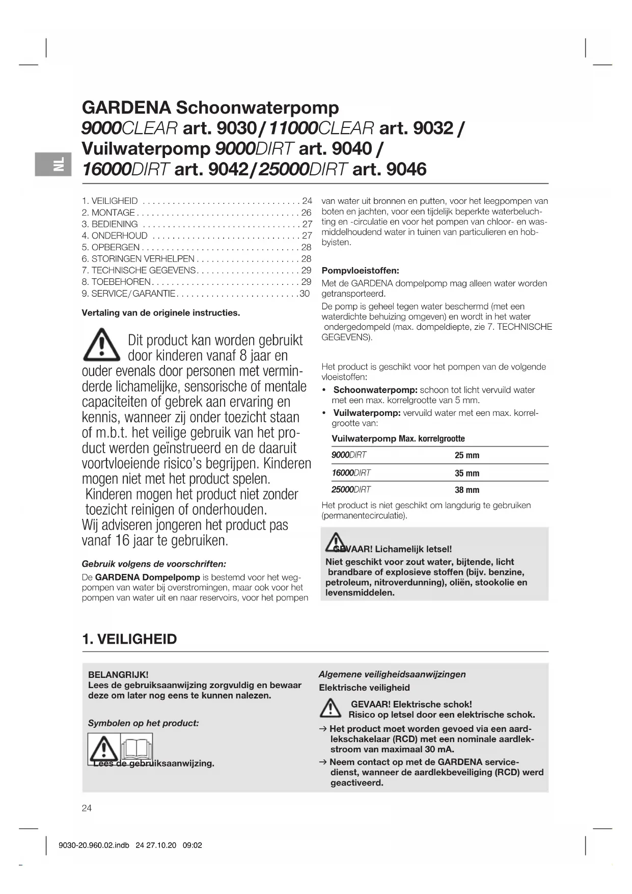 BELANGRIJK! Lees de gebruiksaanwijzing zorgvuldig en bewaar deze om later nog eens te kunnen nalezen. Symbolen op het product: Lees de gebruiksaanwijzing. Algemene veiligheidsaanwijzingen Elektrische veiligheid GEVAAR! Elektrische schok! Risico op letsel door een elektrische schok. v Het product moet worden gevoed via een aard- lekschakelaar (RCD) met een nominale aardlek- stroom van maximaal 30 mA. v Neem contact op met de GARDENA service- dienst, wanneer de aardlekbeveiliging (RCD) werd geactiveerd. GARDENA Schoonwaterpomp 9000CLEAR art. 9030 / 11000CLEAR art. 9032 / Vuilwaterpomp 9000DIRT art. 9040 / 16000DIRT art. 9042 / 25000DIRT art. 9046