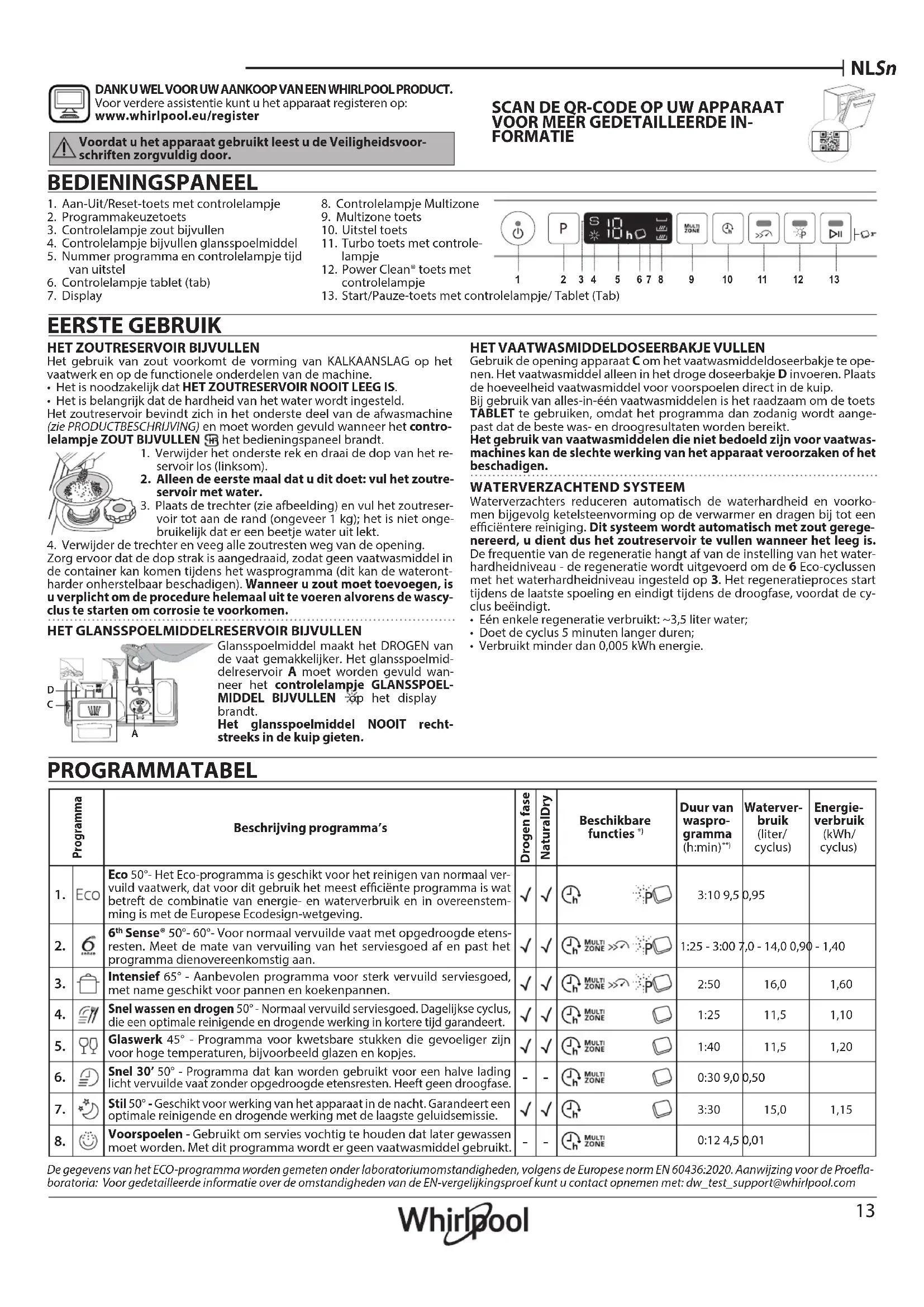 8. Controlelampje Multizone9. Multizone toets10. Uitstel toets11. Turbo toets met controle-lampje12. Power Clean® toets met controlelampje13. Start/Pauze-toets met controlelampje/ Tablet (Tab) De gegevens van het ECO-programma worden gemeten onder laboratoriumomstandigheden, volgens de Europese norm EN 60436:2020. Aanwijzing voor de Proea- boratoria: Voor gedetailleerde informatie over de omstandigheden van de EN-vergelijkingsproef kunt u contact opnemen met: dw_test_support@whirlpool.com14 Snelle Referentiegids