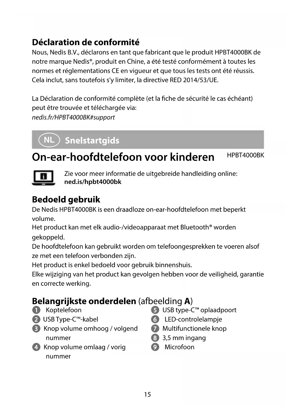 Snelstartgids On-ear-hoofdtelefoon voor kinderen HPBT4000BK Zie voor meer informatie de uitgebreide handleiding online: ned.is/hpbt4000bk Bedoeld gebruik De Nedis HPBT4000BK is een draadloze on-ear-hoofdtelefoon met beperkt volume. Het product kan met elk audio-/videoapparaat met Bluetooth® worden gekoppeld. De hoofdtelefoon kan gebruikt worden om telefoongesprekken te voeren alsof ze met een telefoon verbonden zijn. Het product is enkel bedoeld voor gebruik binnenshuis. Elke wijziging van het product kan gevolgen hebben voor de veiligheid, garantie en correcte werking. Belangrijkste onderdelen (afbeelding A) 1 Koptelefoon 2 USB Type-C™-kabel 3 Knop volume omhoog / volgend nummer 4 Knop volume omlaag / vorig nummer 5 USB type-C™ oplaadpoort 6 LED-controlelampje 7 Multifunctionele knop 8 3,5 mm ingang 9 Microfoon16 Veiligheidsvoorschriften Om mogelijke gehoorbeschadiging te voorkomen, moet u niet lange tijd op een hoog volumeniveau (naar muziek) luisteren.