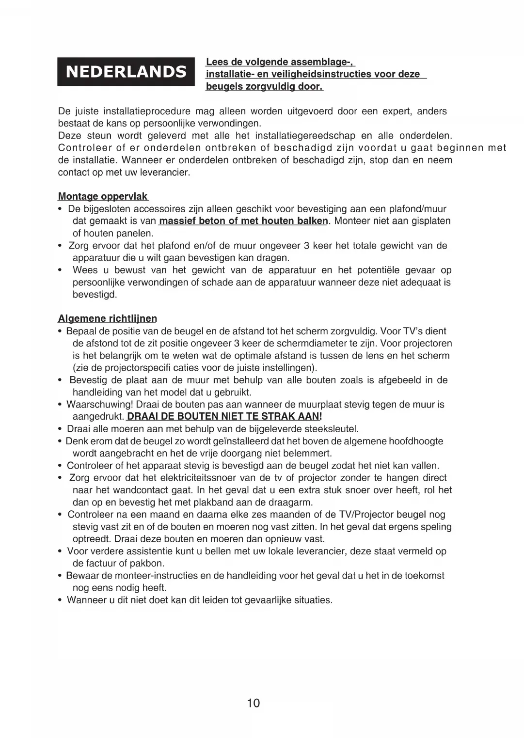 - Controleer na een maand en daarna elke zes maanden of de TV/Projector beugel nog stevig vast zit en of de bouten en moeren nog vast zitten. In het geval dat ergens speling optreedt. Draai deze bouten en moeren dan opnieuw vast.