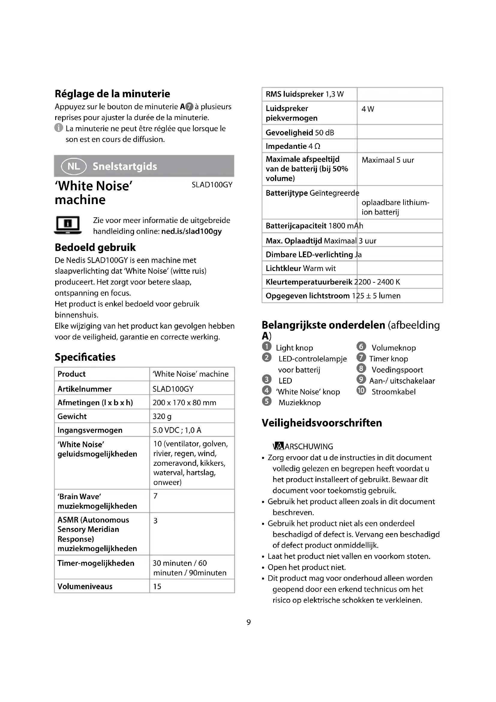 Snelstartgids ‘White Noise’ machine SLAD100GYZie voor meer informatie de uitgebreide handleiding online: ned.is/slad100gy Bedoeld gebruik De Nedis SLAD100GY is een machine met slaapverlichting dat ‘White Noise’ (witte ruis) produceert. Het zorgt voor betere slaap, ontspanning en focus.Het product is enkel bedoeld voor gebruik binnenshuis.Elke wijziging van het product kan gevolgen hebben voor de veiligheid, garantie en correcte werking. Specicaties Product ‘White Noise’ machineArtikelnummer SLAD100GYAfmetingen (l x b x h) 200 x 170 x 80 mmGewicht 320 gIngangsvermogen 5.0 VDC ; 1,0 A‘White Noise’ geluidsmogelijkheden10 (ventilator, golven, rivier, regen, wind, zomeravond, kikkers, waterval, hartslag, onweer)‘Brain Wave’ muziekmogelijkheden ASMR (Autonomous Sensory Meridian Response) muziekmogelijkheden Timer-mogelijkheden 30 minuten / 60 minuten / 90minutenVolumeniveaus 1510 ‘Brain Wave’ en ASMR-muziek gebruiken Houd de muziekknop A