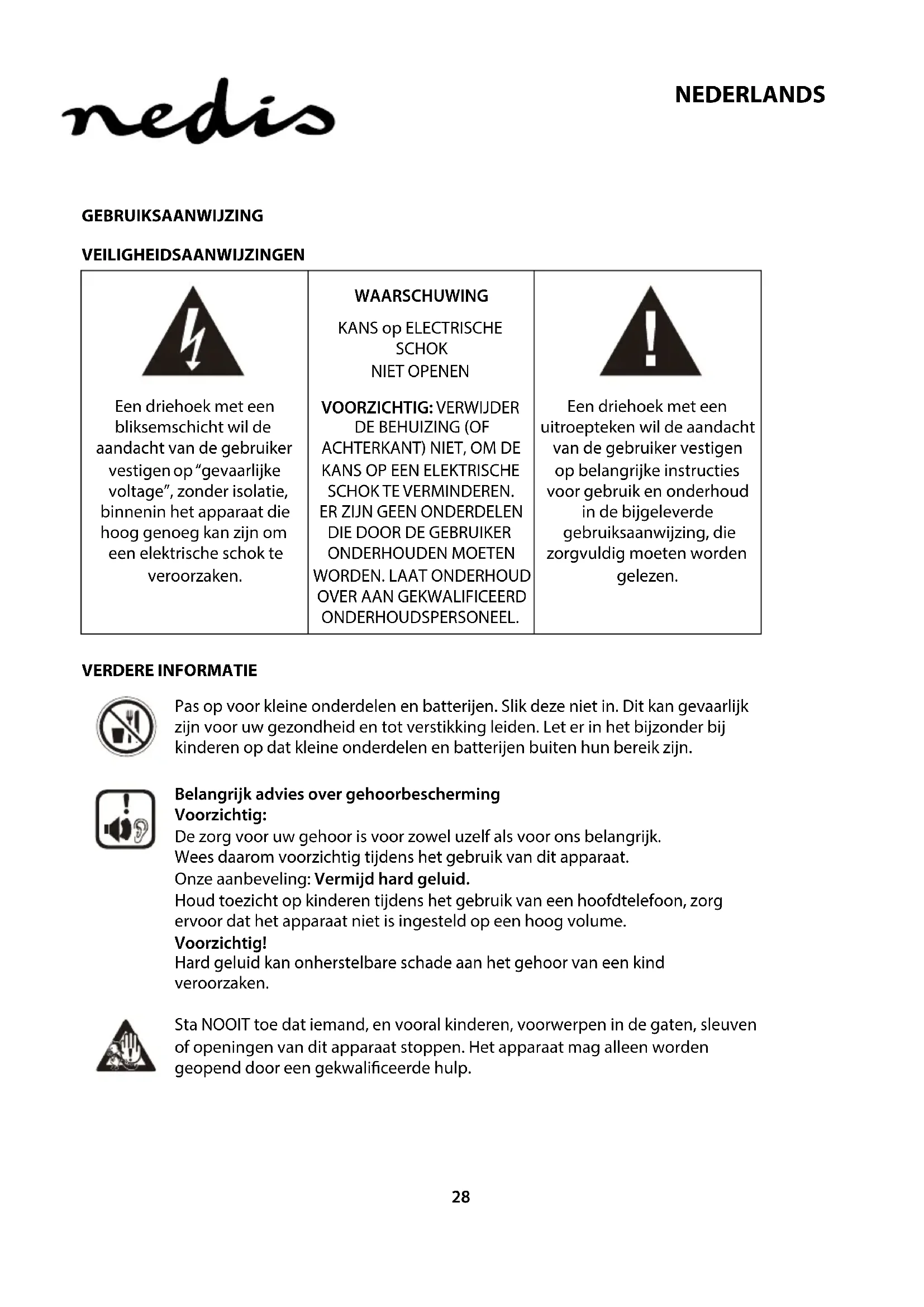 ONDERHOUDSPERSONEEL. Een driehoek met een uitroepteken wil de aandacht van de gebruiker vestigen op belangrijke instructies voor gebruik en onderhoud in de bijgeleverde gebruiksaanwijzing, die zorgvuldig moeten worden gelezen. VERDERE INFORMATIE Pas op voor kleine onderdelen en batterijen. Slik deze niet in. Dit kan gevaarlijk zijn voor uw gezondheid en tot verstikking leiden. Let er in het bijzonder bij kinderen op dat kleine onderdelen en batterijen buiten hun bereik zijn. Belangrijk advies over gehoorbescherming Voorzichtig: De zorg voor uw gehoor is voor zowel uzelf als voor ons belangrijk. Wees daarom voorzichtig tijdens het gebruik van dit apparaat. Onze aanbeveling: Vermijd hard geluid. Houd toezicht op kinderen tijdens het gebruik van een hoofdtelefoon, zorg ervoor dat het apparaat niet is ingesteld op een hoog volume. Voorzichtig! Hard geluid kan onherstelbare schade aan het gehoor van een kind veroorzaken. Sta NOOIT toe dat iemand, en vooral kinderen, voorwerpen in de gaten, sleuven of openingen van dit apparaat stoppen. Het apparaat mag alleen worden geopend door een gekwaliceerde hulp.29 NEDERLANDS Gebruik het apparaat alleen voor het beoogde doel. Dit apparaat mag alleen worden gebruikt in huizen en bedrijfsruimten. Bewaar deze handleiding voor verdere naslag. Instructies voor milieuvriendelijke afvoer Gooi dit product niet weg met het gebruikelijke huishoudelijke afval aan het einde van de levenscyclus. Geef het af bij een inzamelpunt voor de recycling van elektrische en elektronische apparaten. Het symbool op het product en de gebruiksaanwijzing of de verpakking informeren u over de methoden voor verwijdering. De materialen zijn recyclebaar zoals vermeld in de merktekens. Met het hergebruik, recycling van materiaal of andere vormen van hergebruik van oude apparaten, levert u een belangrijke bijdrage aan de bescherming van ons milieu. Informeer bij de gemeentelijke administratie voor het aangewezen afvalinzamelingspunt. Blokkeer de ventilatieopeningen van het apparaat niet. Zorg ervoor dat er geen gordijnen, kranten, meubels of enig ander type object het ventilatiesysteem van het apparaat blokkeert. Het ventilatiesysteem mag nooit worden geblokkeerd door objecten! Oververhitting kan leiden tot ernstige schade aan het apparaat en kan de prestaties en de levensduur verminderen. Hitte en warmte Stel het apparaat niet bloot aan direct zonlicht. Zorg ervoor dat het apparaat niet wordt blootgesteld aan directe warmtebronnen zoals kachels of open vuur. Zorg ervoor dat de ventilatiesleuven van het apparaat niet zijn afgedekt. Vocht en reiniging Dit apparaat is niet waterdicht! Dompel de speler niet onder in water. Sta niet toe dat de speler in contact komt met water. Als er water in de speler komt kan dit ernstige schade veroorzaken. Gebruik geen schoonmaakmiddelen die alcohol, ammoniak, benzeen of schuurmiddelen bevatten, deze kunnen de speler beschadigen. Gebruik voor het schoonmaken een zachte, vochtige doek. Professionele recycling Batterijen en verpakking horen niet thuis in het huisafval. De batterijen moeten worden ingeleverd bij een verzamelpunt voor gebruikte batterijen. Het scheiden van wegwerpverpakkingsmateriaal is milieuvriendelijk.30 NEDERLANDS BELANGRIJKE VEILIGHEIDSINFORMATIE Lees deze aanwijzingen aandachtig door voordat u het toestel in gebruik neemt om te verzekeren dat u het toestel lange tijd probleemloos kunt gebruiken.