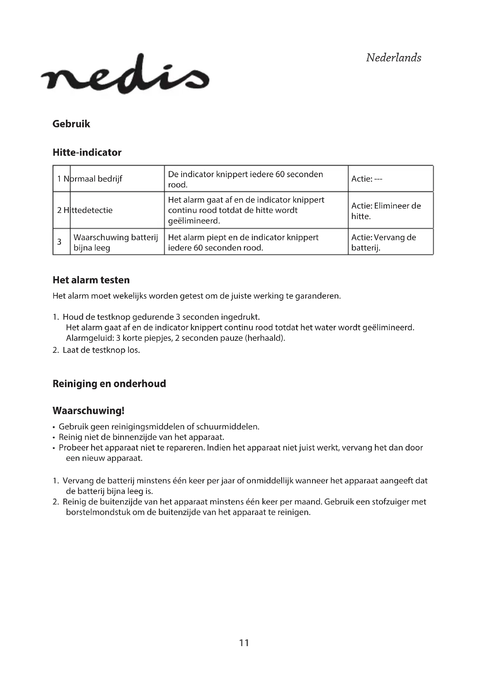 - Schilder het apparaat niet. Ruimte Ja Nee Woonkamer X Eetkamer X Keuken X Badkamer / Toilet X Slaapkamer X Gang X Zolder X Kelder X Garage X Boilerruimte X DTCTH10WT.indd 9 12-4-2018 12:09:3410 Nederlands min.10 cm min.10 cm max. 30 cm 122 cm 90 cm 90 cm 5 mm DTCTH10WT.indd 10 12-4-2018 12:09:3411 Nederlands Gebruik Hitte-indicator 1 Normaal bedrijf De indicator knippert iedere 60seconden rood. Actie: --- 2 Hittedetectie Het alarm gaat af en de indicator knippert continu rood totdat de hitte wordt geëlimineerd. Actie: Elimineer de hitte.