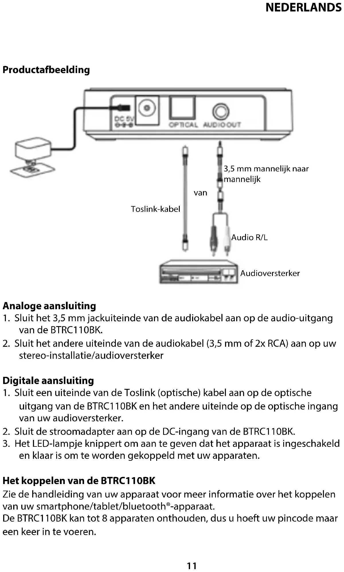 sluiten. LED-indicatie Indicatie Betekenis Beschrijving Knippert elke 5seconden Verbinden Zoek het apparaat via verbindingsmodus/wachten op verbinding Brandt continu Verbonden BTRC110BK en het apparaat zijn verbonden Probleemoplossing Als u geen muziek hoort uit de luidsprekers, controleert u het volgende: - zorg dat de BTRC110BK van stroom is voorzien; - controleer of de audiokabel correct is aangesloten op de BTRC110BK; - zorg ervoor dat de audiobron op uw versterker correct is; - zorg ervoor dat het volume hoog genoeg is; - zorg ervoor dat de apparaten zich binnen elkaars bereik bevinden; - zorg ervoor dat de bluetooth® functie is geactiveerd op uw apparaat; - zorg ervoor dat er muziek wordt afgespeeld op uw apparaat.NEDERLANDS