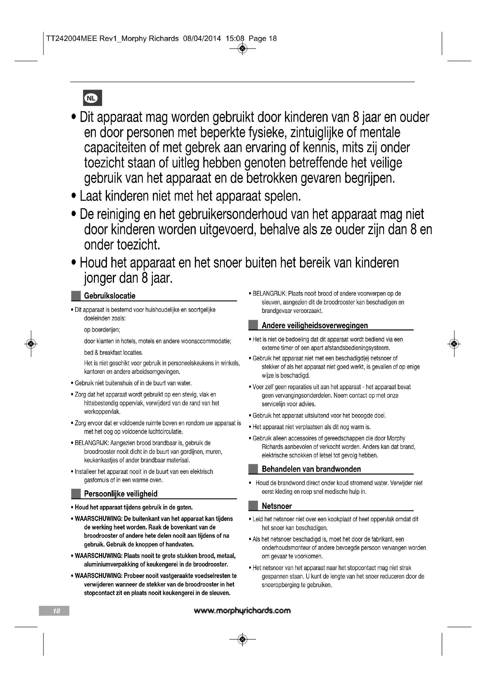 TT242004MEE Rev1_Morphy Richards 08/04/2014 15:08 Page 1920 kleine broodjes geroosterd worden. Zorg er echter wel voor dat de sneetjes niet te dik zijn zodat ze kunnen aanbranden of in de broodsleuven vast komen te zitten.