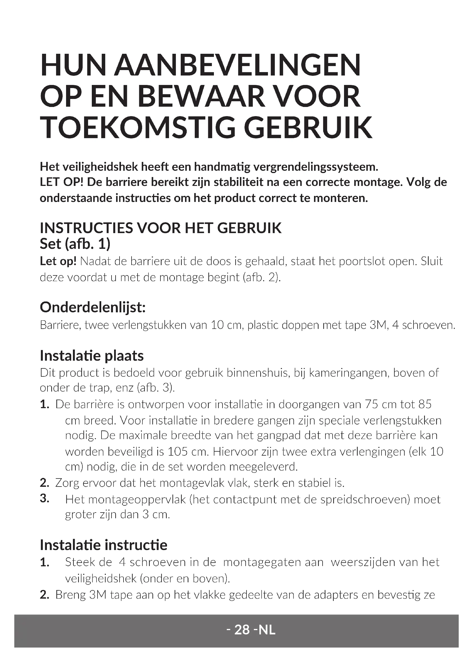 TOEKOMSTIG GEBRUIK Het veiligheidshek hee een handmag vergrendelingssysteem. LET OP! De barriere bereikt zijn stabiliteit na een correcte montage. Volg de onderstaande instruces om het product correct te monteren.