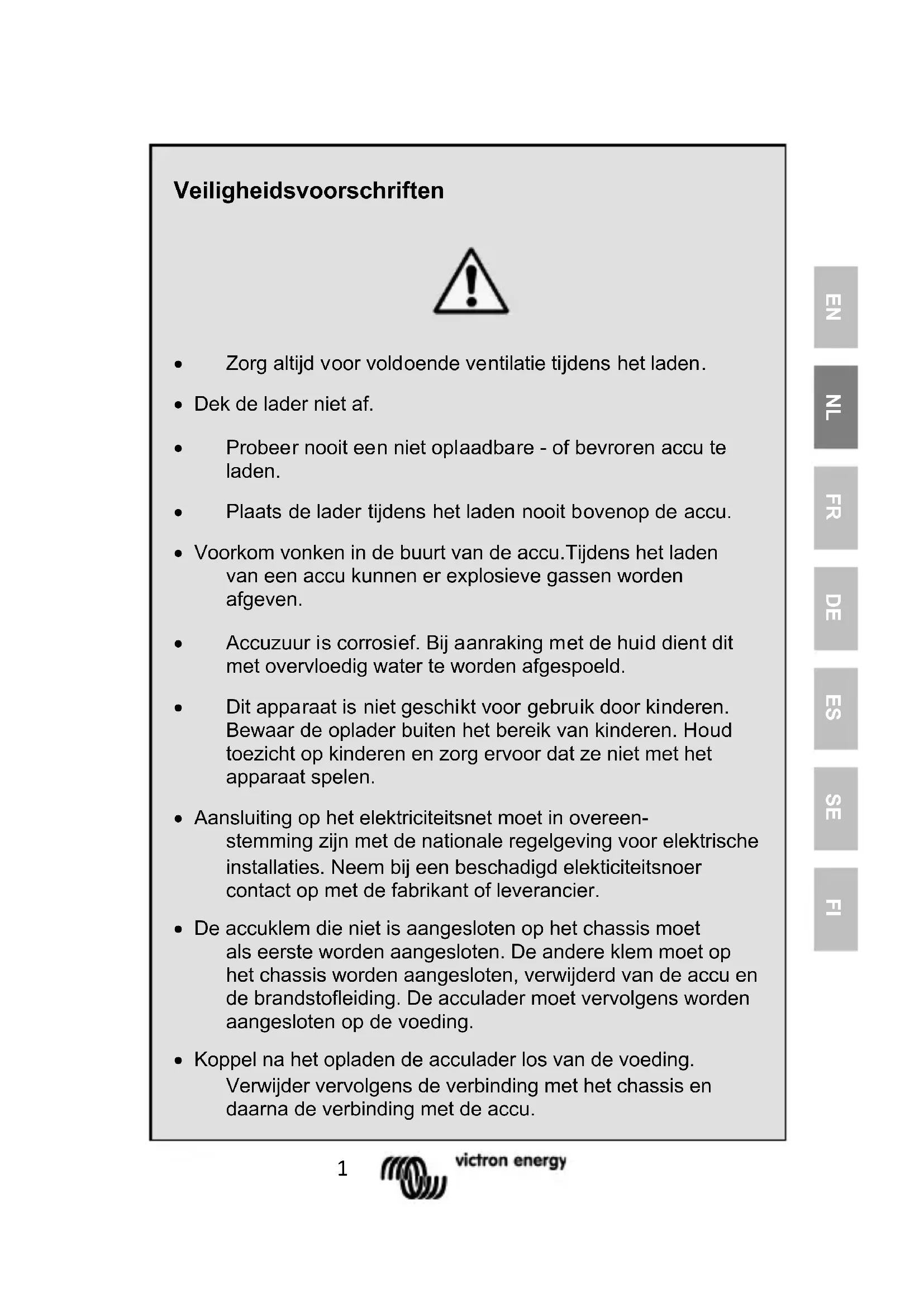 Blue Smart IP65 Charger 12V 4/5/7/10/15/25A 24V 5/8/13A Ingangsspanning 230 VAC Rendement 94% 95% Standby verbruik 0,5W Minimum accuspanning Tot 0 Volt Laadspanning 'absorption' Normal: 14,4V High: 14,7V Li-ion: 14,2V Normal: 28,8V High: 29,4V Li-ion: 28,4V Laadspanning 'float' Normal: 13,8V High: 13,8V Li-ion: 13,5V Normal: 27,6V High: 27,6V Li-ion: 27,0V Laadspanning 'storage' Normal: 13,2V High: 13,2V Li-ion: 13,5V Normal: 26,4V High: 26,4V Li-ion: 27,0V Laadstroom 4 / 5 / 7 / 10 / 15 / 25A 5 / 8 / 13A Laadstroom in modus Lage stroom 2 / 2 / 2 / 3 / 4 / 10A 2 / 3 / 4A Temperatuur compensatie (alleen voor lood accu’s) 16 mV/°C 32 mV/°C Bruikbaar als voeding Ja Drain lekstroom 0,7Ah/maand (1 mA) Beveiligingen Omgepoold aansluiten Kortsluiting Oververhitting Temperatuur bereik -30 tot +50°C (nominale stroom tot 30°C) Vocht Max 100%, continu 95% BEHUIZING Accu aansluiting Zwarte en rode kabel, 1,5 meter Netaansluiting Kabel van 1,5 meter met Europese stekker klasse 1 Beschermklasse IP65 Gewicht IP65 12V 25A 24V 13A: 1,9kg Anderen: 0,9kg Afmetingen (h x w x d) IP65s 12V 4/5A: 45 x 81 x 182mm IP65 12V 7A 24V 5A: 47 x 95 x 190mm IP65 12V 10/15A 24V 8A: 60 x 105 x 190mm IP65 12V 25A 24V 13A: 75 x 140 x 240mm NORMEN Veiligheid EN 60335-1, EN 60335-2-29 Emissie EN 55014-1, EN 61000-6-3, EN 61000-3-2 Immuniteit EN 55014-2, EN 61000-6-1, EN 61000-6-2, EN 61000-3-312 Vijf jaar beperkte garantie Deze beperkte garantie geldt voor defecten in materiaal en uitvoering van dit product gedurende vijf jaar na aankoopdatum van dit product. De klant dient het product samen met aankoopnota aan het verkooppunt te retourneren. Deze beperkte garantie geldt niet voor beschadiging, aantasting of defecten als gevolg van verandering, modificatie, onjuist of buitensporig gebruik of misbruik, verwaarlozing, blootstelling aan overmatig vocht, vuur, onjuiste verpakking, bliksem, stroompieken of andere natuurverschijnselen. Deze beperkte garantie geldt niet voor beschadiging, aantasting of defecten als gevolg van reparaties die zijn gepoogd door niet hiervoor door Victron Energy geautoriseerde personen. Victron Energy kan niet aansprakelijk worden gesteld voor gevolgschade die is ontstaan door het gebruik van dit product. De maximale aansprakelijkheid van Victron Energy onder deze beperkte garantie zal de aankoopprijs van dit product niet overschrijden.1 EN NL FR DE ES SE FI Consignes de sécurité
