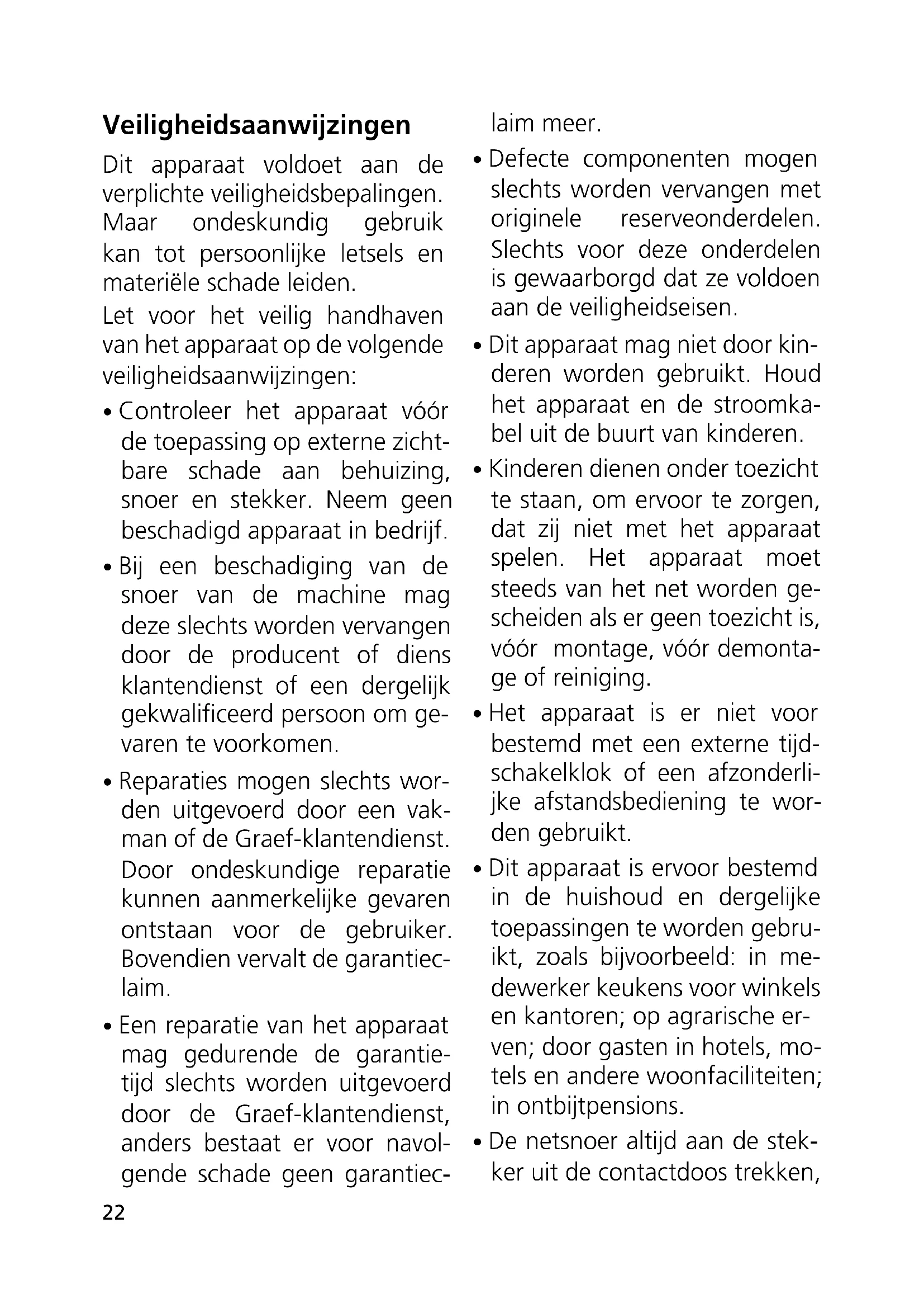 - Reparaties mogen slechts wor- den uitgevoerd door een vak- man of de Graef-klantendienst. Door ondeskundige reparatie kunnen aanmerkelijke gevaren ontstaan voor de gebruiker. Bovendien vervalt de garantiec- laim.