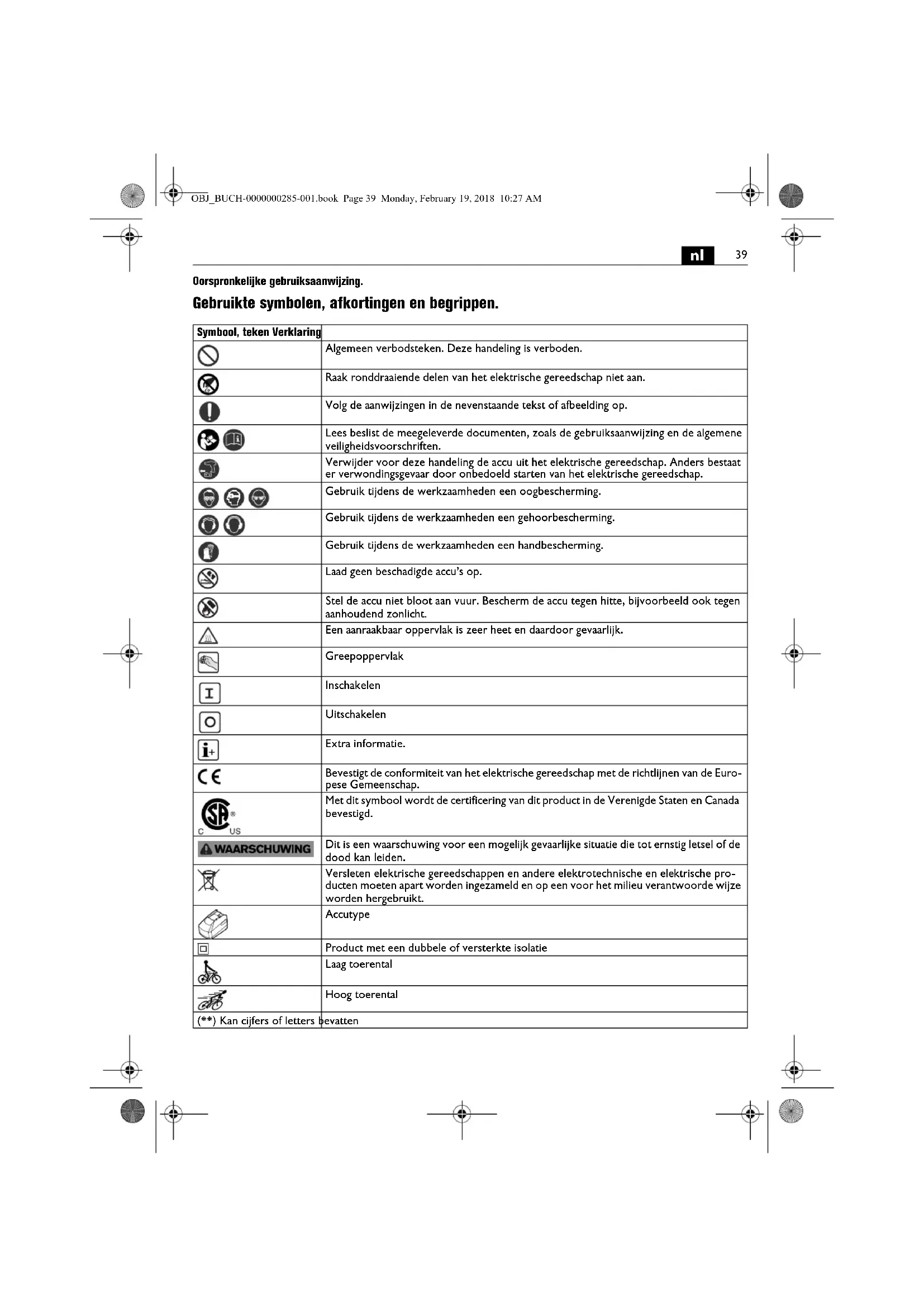 Oorspronkelijke gebruiksaanwijzing. Gebruikte symbolen, afkortingen en begrippen. Symbool, teken Verklaring Algemeen verbodsteken. Deze handeling is verboden. Raak ronddraaiende delen van het elektrische gereedschap niet aan. Volg de aanwijzingen in de nevenstaande tekst of afbeelding op. Lees beslist de meegeleverde documenten, zoals de gebruiksaanwijzing en de algemene veiligheidsvoorschriften. Verwijder voor deze handeling de accu uit het elektrische gereedschap. Anders bestaat er verwondingsgevaar door onbedoeld starten van het elektrische gereedschap. Gebruik tijdens de werkzaamheden een oogbescherming. Gebruik tijdens de werkzaamheden een gehoorbescherming. Gebruik tijdens de werkzaamheden een handbescherming. Laad geen beschadigde accu’s op. Stel de accu niet bloot aan vuur. Bescherm de accu tegen hitte, bijvoorbeeld ook tegen aanhoudend zonlicht. Een aanraakbaar oppervlak is zeer heet en daardoor gevaarlijk. Greepoppervlak Inschakelen Uitschakelen Extra informatie. Bevestigt de conformiteit van het elektrische gereedschap met de richtlijnen van de Euro- pese Gemeenschap. Met dit symbool wordt de certificering van dit product in de Verenigde Staten en Canada bevestigd. Dit is een waarschuwing voor een mogelijk gevaarlijke situatie die tot ernstig letsel of de dood kan leiden. Versleten elektrische gereedschappen en andere elektrotechnische en elektrische pro- ducten moeten apart worden ingezameld en op een voor het milieu verantwoorde wijze worden hergebruikt. Accutype Product met een dubbele of versterkte isolatie Laag toerental Hoog toerental (**) Kan cijfers of letters bevatten OBJ_BUCH-0000000285-001.book Page 39 Monday, February 19, 2018 10:27 AM40