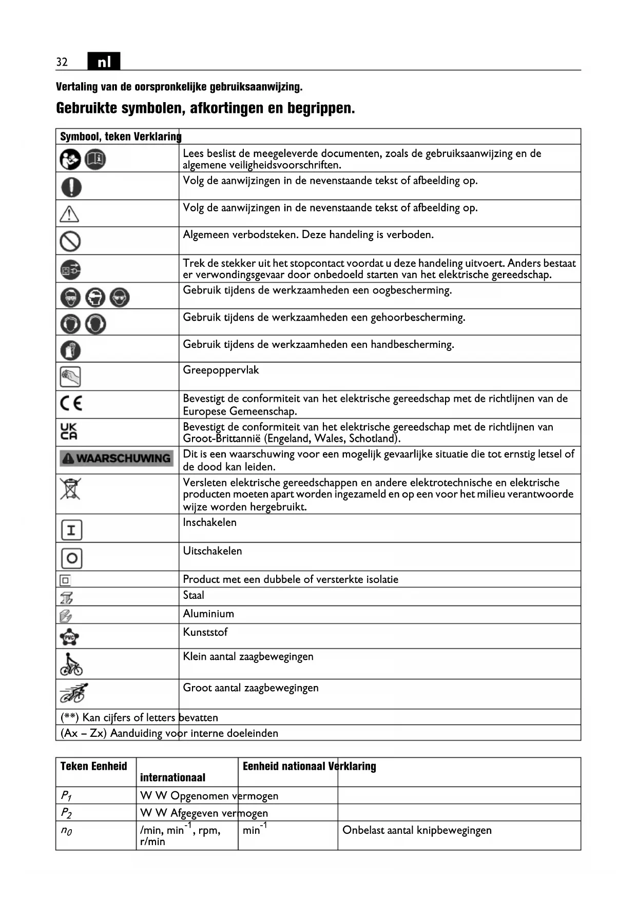 Vertaling van de oorspronkelijke gebruiksaanwijzing. Gebruikte symbolen, afkortingen en begrippen. Symbool, teken Verklaring Lees beslist de meegeleverde documenten, zoals de gebruiksaanwijzing en de algemene veiligheidsvoorschriften. Volg de aanwijzingen in de nevenstaande tekst of afbeelding op. Volg de aanwijzingen in de nevenstaande tekst of afbeelding op. Algemeen verbodsteken. Deze handeling is verboden. Trek de stekker uit het stopcontact voordat u deze handeling uitvoert. Anders bestaat er verwondingsgevaar door onbedoeld starten van het elektrische gereedschap. Gebruik tijdens de werkzaamheden een oogbescherming. Gebruik tijdens de werkzaamheden een gehoorbescherming. Gebruik tijdens de werkzaamheden een handbescherming. Greepoppervlak Bevestigt de conformiteit van het elektrische gereedschap met de richtlijnen van de Europese Gemeenschap. Bevestigt de conformiteit van het elektrische gereedschap met de richtlijnen van Groot-Brittannië (Engeland, Wales, Schotland). Dit is een waarschuwing voor een mogelijk gevaarlijke situatie die tot ernstig letsel of de dood kan leiden. Versleten elektrische gereedschappen en andere elektrotechnische en elektrische producten moeten apart worden ingezameld en op een voor het milieu verantwoorde wijze worden hergebruikt. Inschakelen Uitschakelen Product met een dubbele of versterkte isolatie Staal Aluminium Kunststof Klein aantal zaagbewegingen Groot aantal zaagbewegingen (**) Kan cijfers of letters bevatten (Ax – Zx) Aanduiding voor interne doeleinden Teken Eenheid internationaal Eenheid nationaal Verklaring