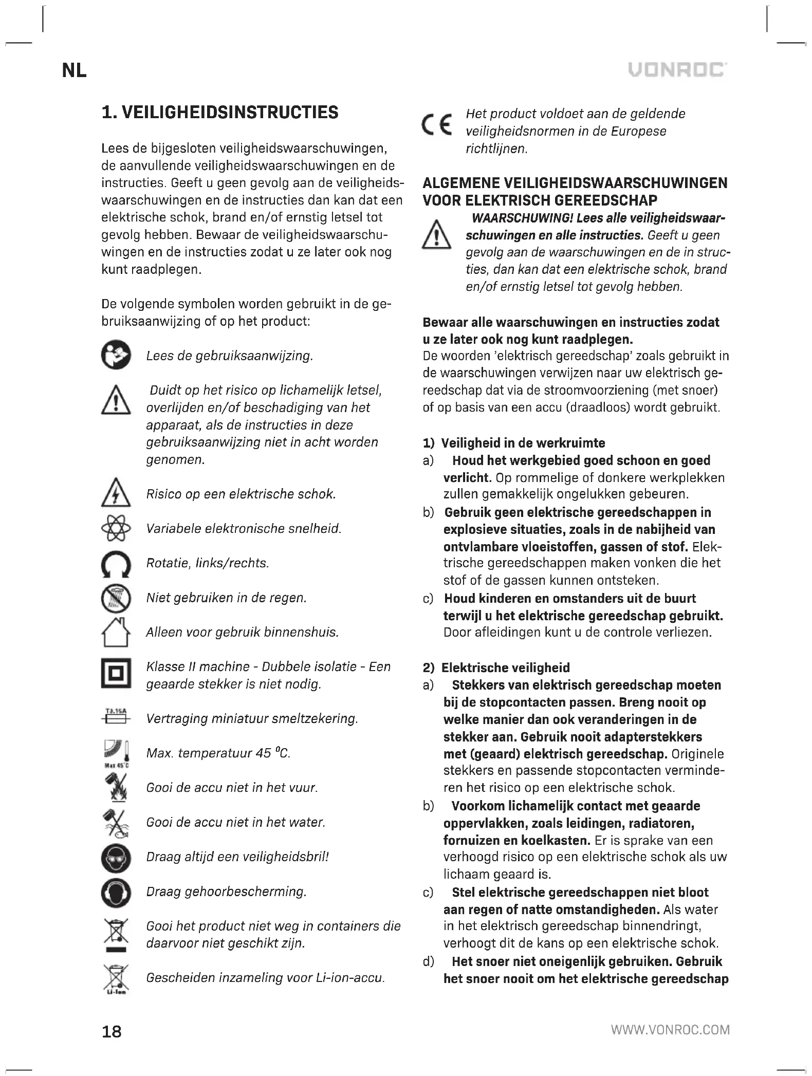 Voorafgaand aan het reinigen en het onderhoud dient het apparaat te allen tijde uitgeschakeld te worden en moet de accu uit het apparaat worden genomen. Maak de behuizing van het apparaat regelmatig schoon met een zachte doek, bij voorkeur na ieder gebruik. Controleer of de ventilatieopeningen vrij zijn van stof en vuil. Verwijder hardnekkig vuil met een zachte doek vochtig gemaakt met een zee- poplossing. Gebruik geen oplosmiddelen zoals ben- zine, alcohol, ammoniak, enzovoorts. Chemicaliën zoals deze kunnen de synthetische componenten beschadigen. MILIEU Niet goed functionerende en/of afgedankte elektrische of elektronische apparaten moeten bij de juiste inzamelpunten voor recycling worden aangeboden. Alleen voor landen in de EG Gooi geen elektrisch gereedschap bij het huis- vuil. Volgens de Europese richtlijnen 2012/19/EC betreffende afgedankte elektrische en elektronische apparatuur en de implementatie hiervan in nationaal recht, moeten elektrische gereedschappen die niet langer gebruikt worden apart ingezameld en wegge- gooid worden op een milieuvriendelijk manier. GARANTIE Producten van VONROC worden op basis van de hoogste kwaliteitsnormen ontwikkeld en zijn gega- randeerd vrij van defecten, zowel voor wat betreft het materiaal als de afwerking, gedurende de door de wet bepaalde periode, startend vanaf de datum van de originele aankoop. Mocht het product gedurende deze periode enige storingen vertonen als gevolg van gebrekkig materiaal en/of gebrek- kige afwerking, dient direct contact met VONROC opgenomen te worden. De volgende omstandigheden zijn uitgesloten van de garantie: