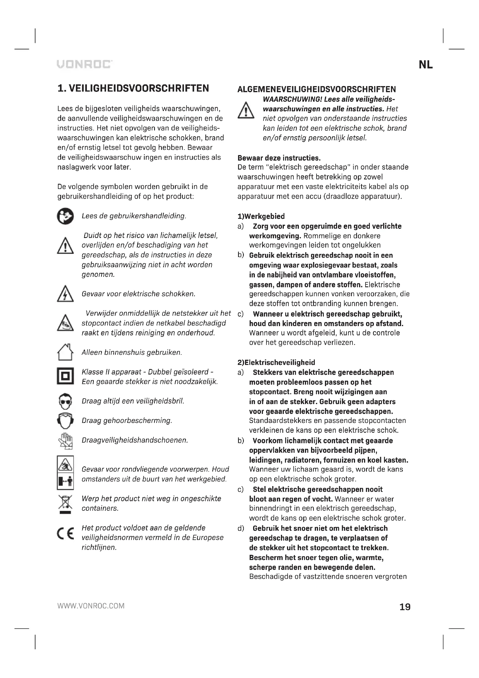Zorg dat de machine niet onder spanning staat wanneer onderhoudswerkzaamheden aan het mechaniek worden uitgevoerd. Reinig de machinebehuizing regelmatig met een zachte doek, bij voorkeur iedere keer na gebruik. Zorg dat de ventilatiesleuven vrij van stof en vuil zijn. Gebruik bij hardnekkig vuil een zachte doek bevochtigd met zeepwater. Gebruik geen oplosmid- delen als benzine, alcohol, ammonia, etc. Dergelij- ke stoffen beschadigen de kunststof onderdelen. MILIEU Defecte en/of afgedankte elektrische of elektronische gereedschappen dienen ter verwerking te worden aangeboden aan een daarvoor verantwoordelijke instantie. Uitsluitend voor EG-landen Werp elektrisch gereedschap niet weg bij het huisvuil. Conform de Europese Richtlijn 2012/19/ EG voor Afgedankte Elektrische en Elektronische Apparatuur en de implementatie ervan in nationaal recht moet niet langer te gebruiken elektrisch gereedschap gescheiden worden verzameld en op een milieuvriendelijke wijze worden verwerkt. GARANTIE VONROC producten zijn ontworpen volgens de hoogste kwaliteitsstandaarden en gegarandeerd vrij van defecten, zowel materieel als fabrieksfouten, tijdens de wettelijk vastgestelde garantieperiode vanaf de eerste aankoopdatum. Mocht het product tijdens deze periode gebreken vertonen veroorzaakt door defecte materialen en/of fabrieksfouten, neem dan rechtstreeks contact op met VONROC. De volgende situaties vallen niet onder de garantie: