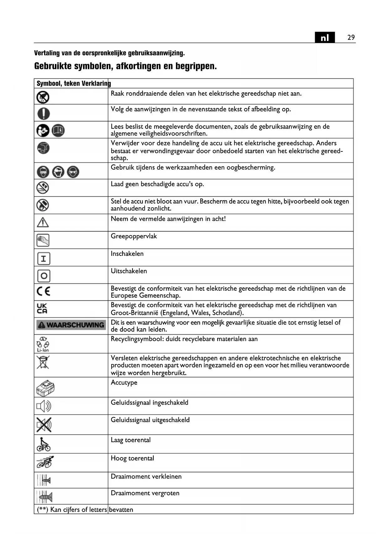 Vertaling van de oorspronkelijke gebruiksaanwijzing. Gebruikte symbolen, afkortingen en begrippen. Symbool, teken Verklaring Raak ronddraaiende delen van het elektrische gereedschap niet aan. Volg de aanwijzingen in de nevenstaande tekst of afbeelding op. Lees beslist de meegeleverde documenten, zoals de gebruiksaanwijzing en de algemene veiligheidsvoorschriften. Verwijder voor deze handeling de accu uit het elektrische gereedschap. Anders bestaat er verwondingsgevaar door onbedoeld starten van het elektrische gereed- schap. Gebruik tijdens de werkzaamheden een oogbescherming. Laad geen beschadigde accu’s op. Stel de accu niet bloot aan vuur. Bescherm de accu tegen hitte, bijvoorbeeld ook tegen aanhoudend zonlicht. Neem de vermelde aanwijzingen in acht! Greepoppervlak Inschakelen Uitschakelen Bevestigt de conformiteit van het elektrische gereedschap met de richtlijnen van de Europese Gemeenschap. Bevestigt de conformiteit van het elektrische gereedschap met de richtlijnen van Groot-Brittannië (Engeland, Wales, Schotland). Dit is een waarschuwing voor een mogelijk gevaarlijke situatie die tot ernstig letsel of de dood kan leiden. Recyclingsymbool: duidt recyclebare materialen aan Versleten elektrische gereedschappen en andere elektrotechnische en elektrische producten moeten apart worden ingezameld en op een voor het milieu verantwoorde wijze worden hergebruikt. Accutype Geluidssignaal ingeschakeld Geluidssignaal uitgeschakeld Laag toerental Hoog toerental Draaimoment verkleinen Draaimoment vergroten (**) Kan cijfers of letters bevatten30