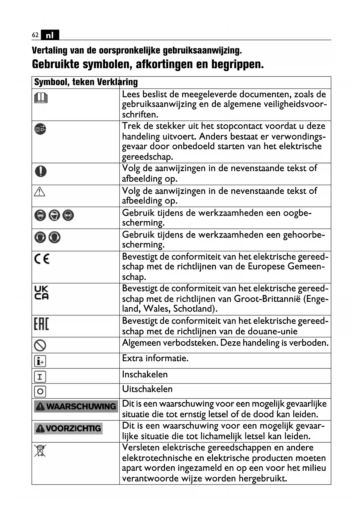 Vertaling van de oorspronkelijke gebruiksaanwijzing. Gebruikte symbolen, afkortingen en begrippen. Symbool, teken Verklaring Lees beslist de meegeleverde documenten, zoals de gebruiksaanwijzing en de algemene veiligheidsvoor- schriften. Trek de stekker uit het stopcontact voordat u deze handeling uitvoert. Anders bestaat er verwondings- gevaar door onbedoeld starten van het elektrische gereedschap. Volg de aanwijzingen in de nevenstaande tekst of afbeelding op. Volg de aanwijzingen in de nevenstaande tekst of afbeelding op. Gebruik tijdens de werkzaamheden een oogbe- scherming. Gebruik tijdens de werkzaamheden een gehoorbe- scherming. Bevestigt de conformiteit van het elektrische gereed- schap met de richtlijnen van de Europese Gemeen- schap. Bevestigt de conformiteit van het elektrische gereed- schap met de richtlijnen van Groot-Brittannië (Enge- land, Wales, Schotland). Bevestigt de conformiteit van het elektrische gereed- schap met de richtlijnen van de douane-unie Algemeen verbodsteken. Deze handeling is verboden. Extra informatie. Inschakelen Uitschakelen Dit is een waarschuwing voor een mogelijk gevaarlijke situatie die tot ernstig letsel of de dood kan leiden. Dit is een waarschuwing voor een mogelijk gevaar- lijke situatie die tot lichamelijk letsel kan leiden. Versleten elektrische gereedschappen en andere elektrotechnische en elektrische producten moeten apart worden ingezameld en op een voor het milieu verantwoorde wijze worden hergebruikt.63