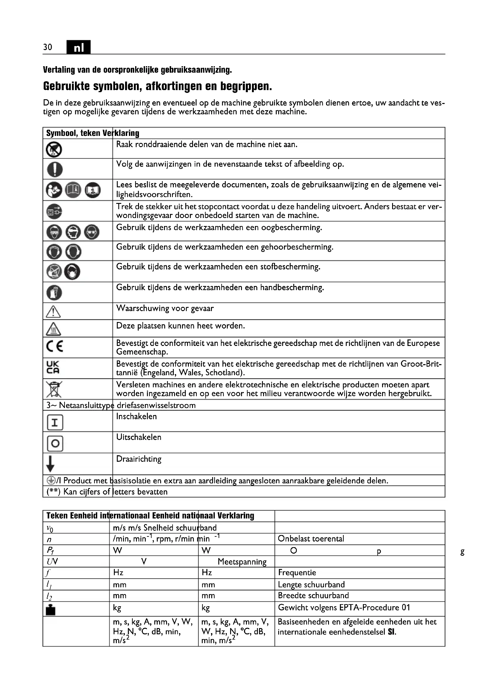 Vertaling van de oorspronkelijke gebruiksaanwijzing. Gebruikte symbolen, afkortingen en begrippen. De in deze gebruiksaanwijzing en eventueel op de machine gebruikte symbolen dienen ertoe, uw aandacht te ves- tigen op mogelijke gevaren tijdens de werkzaamheden met deze machine. Symbool, teken Verklaring Raak ronddraaiende delen van de machine niet aan. Volg de aanwijzingen in de nevenstaande tekst of afbeelding op. Lees beslist de meegeleverde documenten, zoals de gebruiksaanwijzing en de algemene vei- ligheidsvoorschriften. Trek de stekker uit het stopcontact voordat u deze handeling uitvoert. Anders bestaat er ver- wondingsgevaar door onbedoeld starten van de machine. Gebruik tijdens de werkzaamheden een oogbescherming. Gebruik tijdens de werkzaamheden een gehoorbescherming. Gebruik tijdens de werkzaamheden een stofbescherming. Gebruik tijdens de werkzaamheden een handbescherming. Waarschuwing voor gevaar Deze plaatsen kunnen heet worden. Bevestigt de conformiteit van het elektrische gereedschap met de richtlijnen van de Europese Gemeenschap. Bevestigt de conformiteit van het elektrische gereedschap met de richtlijnen van Groot-Brit- tannië (Engeland, Wales, Schotland). Versleten machines en andere elektrotechnische en elektrische producten moeten apart worden ingezameld en op een voor het milieu verantwoorde wijze worden hergebruikt. 3~ Netaansluittype driefasenwisselstroom Inschakelen Uitschakelen Draairichting /I Product met basisisolatie en extra aan aardleiding aangesloten aanraakbare geleidende delen. (**) Kan cijfers of letters bevatten Teken Eenheid internationaal Eenheid nationaal Verklaring