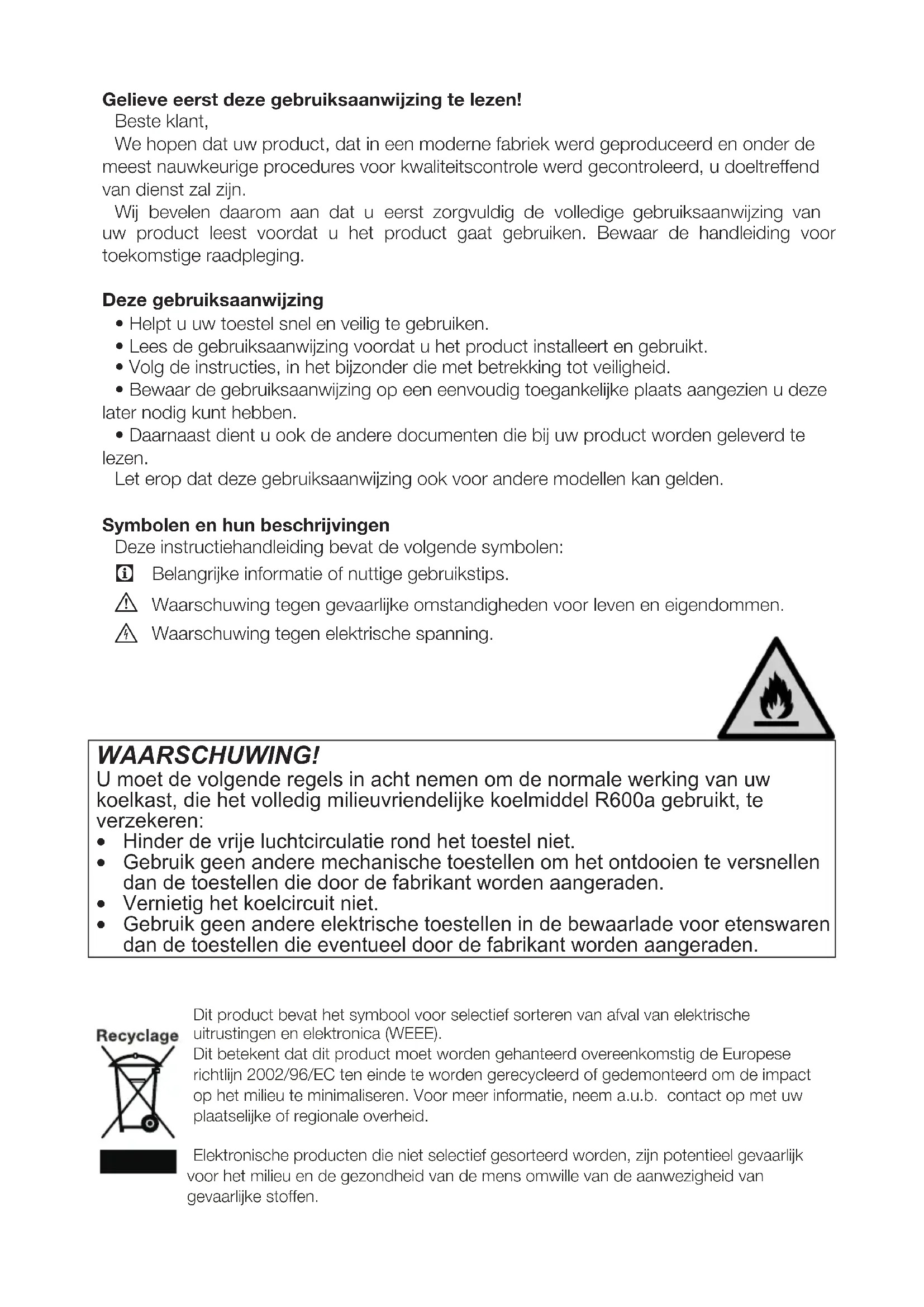 Waarschuwing tegen elektrische spanning. Dit product bevat het symbool voor selectief sorteren van afval van elektrische uitrustingen en elektronica (WEEE). Dit betekent dat dit product moet worden gehanteerd overeenkomstig de Europese richtlijn 2002/96/EC ten einde te worden gerecycleerd of gedemonteerd om de impact op het milieu te minimaliseren. Voor meer informatie, neem a.u.b. contact op met uw plaatselijke of regionale overheid. Elektronische producten die niet selectief gesorteerd worden, zijn potentieel gevaarlijk voor het milieu en de gezondheid van de mens omwille van de aanwezigheid van gevaarlijke stoffen. WAARSCHUWING! U moet de volgende regels in acht nemen om de normale werking van uw koelkast, die het volledig milieuvriendelijke koelmiddel R600a gebruikt, te verzekeren:
