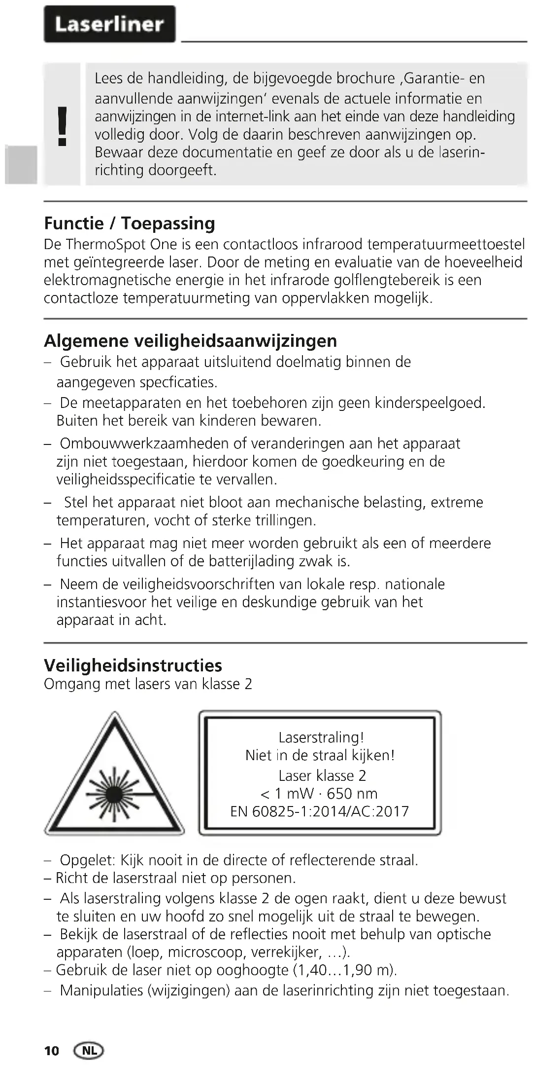 Functie / Toepassing De ThermoSpot One is een contactloos infrarood temperatuurmeettoestel met geïntegreerde laser. Door de meting en evaluatie van de hoeveelheid elektromagnetische energie in het infrarode golengtebereik is een contactloze temperatuurmeting van oppervlakken mogelijk. – Opgelet: Kijk nooit in de directe of reecterende straal. – Richt de laserstraal niet op personen. – Als laserstraling volgens klasse 2 de ogen raakt, dient u deze bewust te sluiten en uw hoofd zo snel mogelijk uit de straal te bewegen. – Bekijk de laserstraal of de reecties nooit met behulp van optische apparaten (loep, microscoop, verrekijker, …). – Gebruik de laser niet op ooghoogte (1,40…1,90 m). – Manipulaties (wijzigingen) aan de laserinrichting zijn niet toegestaan. Veiligheidsinstructies Omgang met lasers van klasse 2 Algemene veiligheidsaanwijzingen – Gebruik het apparaat uitsluitend doelmatig binnen de aangegeven speccaties. – De meetapparaten en het toebehoren zijn geen kinderspeelgoed. Buiten het bereik van kinderen bewaren. – Ombouwwerkzaamheden of veranderingen aan het apparaat zijn niet toegestaan, hierdoor komen de goedkeuring en de veiligheidsspecicatie te vervallen. – Stel het apparaat niet bloot aan mechanische belasting, extreme temperaturen, vocht of sterke trillingen. – Het apparaat mag niet meer worden gebruikt als een of meerdere functies uitvallen of de batterijlading zwak is. – Neem de veiligheidsvoorschriften van lokale resp. nationale instantiesvoor het veilige en deskundige gebruik van het apparaat in acht. Lees de handleiding, de bijgevoegde brochure ‚Garantie- en aanvullende aanwijzingen‘ evenals de actuele informatie en aanwijzingen in de internet-link aan het einde van deze handleiding volledig door. Volg de daarin beschreven aanwijzingen op. Bewaar deze documentatie en geef ze door als u de laserin- richting doorgeeft.