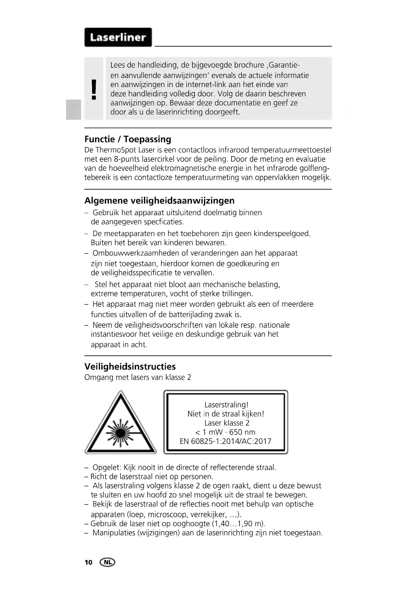 Functie / Toepassing De ThermoSpot Laser is een contactloos infrarood temperatuurmeettoestel met een 8-punts lasercirkel voor de peiling. Door de meting en evaluatie van de hoeveelheid elektromagnetische energie in het infrarode goleng- tebereik is een contactloze temperatuurmeting van oppervlakken mogelk. – Opgelet: Kijk nooit in de directe of reecterende straal. – Richt de laserstraal niet op personen. – Als laserstraling volgens klasse 2 de ogen raakt, dient u deze bewust te sluiten en uw hoofd zo snel mogelijk uit de straal te bewegen. – Bekijk de laserstraal of de reecties nooit met behulp van optische apparaten (loep, microscoop, verrekijker, …). – Gebruik de laser niet op ooghoogte (1,40…1,90 m). – Manipulaties (wijzigingen) aan de laserinrichting zijn niet toegestaan. Veiligheidsinstructies Omgang met lasers van klasse 2 Algemene veiligheidsaanwijzingen – Gebruik het apparaat uitsluitend doelmatig binnen de aangegeven speccaties. – De meetapparaten en het toebehoren zijn geen kinderspeelgoed. Buiten het bereik van kinderen bewaren. – Ombouwwerkzaamheden of veranderingen aan het apparaat zijn niet toegestaan, hierdoor komen de goedkeuring en de veiligheidsspecicatie te vervallen. – Stel het apparaat niet bloot aan mechanische belasting, extreme temperaturen, vocht of sterke trillingen. – Het apparaat mag niet meer worden gebruikt als een of meerdere functies uitvallen of de batterijlading zwak is. – Neem de veiligheidsvoorschriften van lokale resp. nationale instantiesvoor het veilige en deskundige gebruik van het apparaat in acht. Lees de handleiding, de bijgevoegde brochure ‚Garantie- en aanvullende aanwijzingen‘ evenals de actuele informatie en aanwijzingen in de internet-link aan het einde van deze handleiding volledig door. Volg de daarin beschreven aanwijzingen op. Bewaar deze documentatie en geef ze door als u de laserinrichting doorgeeft.