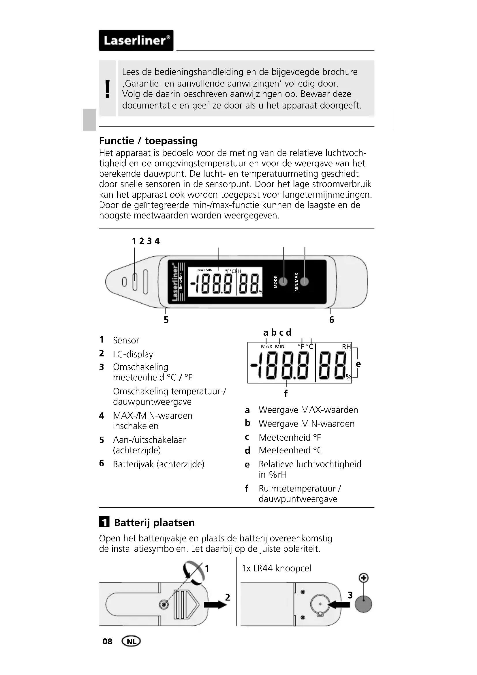 Functie / toepassing Het apparaat is bedoeld voor de meting van de relatieve luchtvoch- tigheid en de omgevingstemperatuur en voor de weergave van het berekende dauwpunt. De lucht- en temperatuurmeting geschiedt door snelle sensoren in de sensorpunt. Door het lage stroomverbruik kan het apparaat ook worden toegepast voor langetermijnmetingen. Door de geïntegreerde min-/max-functie kunnen de laagste en de hoogste meetwaarden worden weergegeven. Sensor LC-display Omschakeling meeteenheid °C / °F Omschakeling temperatuur-/ dauwpuntweergave MAX-/MIN-waarden inschakelen Aan-/uitschakelaar (achterzijde) Batterijvak (achterzijde) Weergave MAX-waarden Weergave MIN-waarden Meeteenheid °F Meeteenheid °C Relatieve luchtvochtigheid in %rH Ruimtetemperatuur / dauwpuntweergave