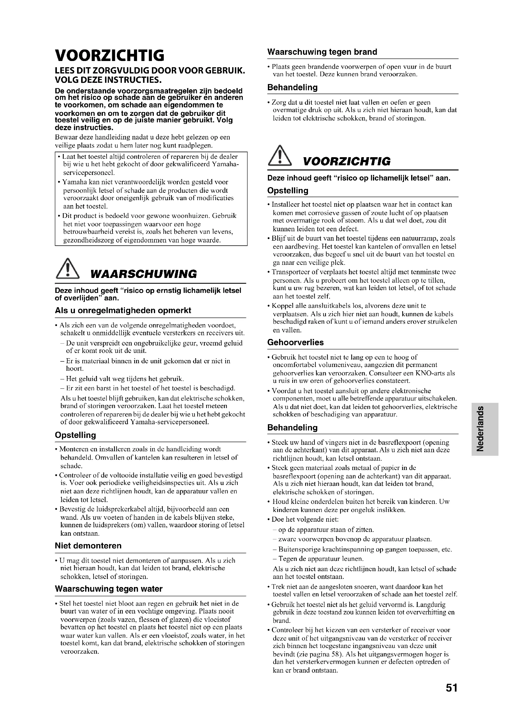 - Als zich een van de volgende onregelmatigheden voordoet, schakelt u onmiddellijk eventuele versterkers en receivers uit. – De unit verspreidt een ongebruikelijke geur, vreemd geluid of er komt rook uit de unit. – Er is materiaal binnen in de unit gekomen dat er niet in hoort. – Het geluid valt weg tijdens het gebruik. – Er zit een barst in het toestel of het toestel is beschadigd. Als u het toestel blijft gebruiken, kan dat elektrische schokken, brand of storingen veroorzaken. Laat het toestel meteen controleren of repareren bij de dealer bij wie u het hebt gekocht of door gekwalificeerd Yamaha-servicepersoneel. Opstelling