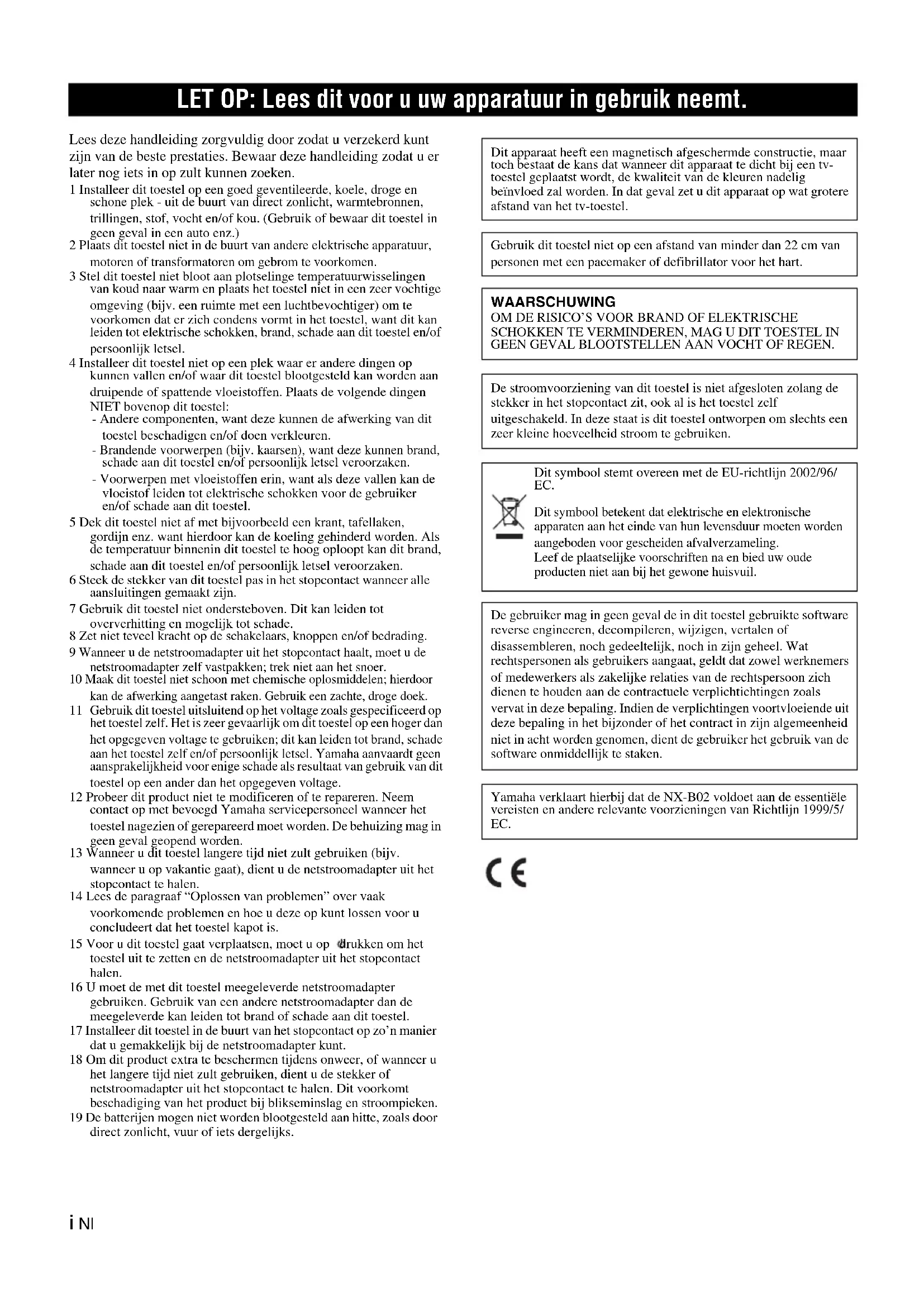 Gebruik dit toestel uitsluitend op het voltage zoals gespecificeerd op het toestel zelf. Het is zeer gevaarlijk om dit toestel op een hoger dan het opgegeven voltage te gebruiken; dit kan leiden tot brand, schade aan het toestel zelf en/of persoonlijk letsel. Yamaha aanvaardt geen aansprakelijkheid voor enige schade als resultaat van gebruik van dit toestel op een ander dan het opgegeven voltage. 12 Probeer dit product niet te modificeren of te repareren. Neem contact op met bevoegd Yamaha servicepersoneel wanneer het toestel nagezien of gerepareerd moet worden. De behuizing mag in geen geval geopend worden. 13 Wanneer u dit toestel langere tijd niet zult gebruiken (bijv. wanneer u op vakantie gaat), dient u de netstroomadapter uit het stopcontact te halen. 14 Lees de paragraaf “Oplossen van problemen” over vaak voorkomende problemen en hoe u deze op kunt lossen voor u concludeert dat het toestel kapot is. 15 Voor u dit toestel gaat verplaatsen, moet u op drukken om het toestel uit te zetten en de netstroomadapter uit het stopcontact halen. 16 U moet de met dit toestel meegeleverde netstroomadapter gebruiken. Gebruik van een andere netstroomadapter dan de meegeleverde kan leiden tot brand of schade aan dit toestel. 17 Installeer dit toestel in de buurt van het stopcontact op zo’n manier dat u gemakkelijk bij de netstroomadapter kunt. 18 Om dit product extra te beschermen tijdens onweer, of wanneer u het langere tijd niet zult gebruiken, dient u de stekker of netstroomadapter uit het stopcontact te halen. Dit voorkomt beschadiging van het product bij blikseminslag en stroompieken. 19 De batterijen mogen niet worden blootgesteld aan hitte, zoals door direct zonlicht, vuur of iets dergelijks. LET OP: Lees dit voor u uw apparatuur in gebruik neemt. Dit apparaat heeft een magnetisch afgeschermde constructie, maar toch bestaat de kans dat wanneer dit apparaat te dicht bij een tv- toestel geplaatst wordt, de kwaliteit van de kleuren nadelig beïnvloed zal worden. In dat geval zet u dit apparaat op wat grotere afstand van het tv-toestel. Gebruik dit toestel niet op een afstand van minder dan 22 cm van personen met een pacemaker of defibrillator voor het hart. WAARSCHUWING OM DE RISICO’S VOOR BRAND OF ELEKTRISCHE SCHOKKEN TE VERMINDEREN, MAG U DIT TOESTEL IN GEEN GEVAL BLOOTSTELLEN AAN VOCHT OF REGEN. De stroomvoorziening van dit toestel is niet afgesloten zolang de stekker in het stopcontact zit, ook al is het toestel zelf uitgeschakeld. In deze staat is dit toestel ontworpen om slechts een zeer kleine hoeveelheid stroom te gebruiken. De gebruiker mag in geen geval de in dit toestel gebruikte software reverse engineeren, decompileren, wijzigen, vertalen of disassembleren, noch gedeeltelijk, noch in zijn geheel. Wat rechtspersonen als gebruikers aangaat, geldt dat zowel werknemers of medewerkers als zakelijke relaties van de rechtspersoon zich dienen te houden aan de contractuele verplichtichtingen zoals vervat in deze bepaling. Indien de verplichtingen voortvloeiende uit deze bepaling in het bijzonder of het contract in zijn algemeenheid niet in acht worden genomen, dient de gebruiker het gebruik van de software onmiddellijk te staken. Yamaha verklaart hierbij dat de NX-B02 voldoet aan de essentiële vereisten en andere relevante voorzieningen van Richtlijn 1999/5/ EC. Dit symbool stemt overeen met de EU-richtlijn 2002/96/ EC. Dit symbool betekent dat elektrische en elektronische apparaten aan het einde van hun levensduur moeten worden aangeboden voor gescheiden afvalverzameling. Leef de plaatselijke voorschriften na en bied uw oude producten niet aan bij het gewone huisvuil.1 Nl Nederlands