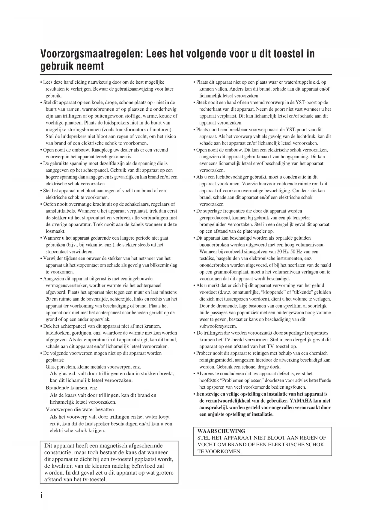 - Een stevige en veilige opstelling en installatie van het apparaat is de verantwoordelijkheid van de gebruiker. YAMAHA kan niet aansprakelijk worden gesteld voor ongevallen veroorzaakt door een onjuiste opstelling of installatie. Dit apparaat heeft een magnetisch afgeschermde constructie, maar toch bestaat de kans dat wanneer dit apparaat te dicht bij een tv-toestel geplaatst wordt, de kwaliteit van de kleuren nadelig beïnvloed zal worden. In dat geval zet u dit apparaat op wat grotere afstand van het tv-toestel. WAARSCHUWING STEL HET APPARAAT NIET BLOOT AAN REGEN OF VOCHT OM BRAND OF EEN ELEKTRISCHE SCHOK TE VOORKOMEN.1 Inhoudsopgave Voorzorgsmaatregelen: Lees het volgende voor u dit toestel in gebruik neemt . . . . . . . . . i Inleiding . . . . . . . . . . . . . . . . . . . . . . . . . . . . . . . . . . . . . . . . . . . . . . . . . . . . . . . . 1 Kenmerken. . . . . . . . . . . . . . . . . . . . . . . . . . . . . . . . . . . . . . . . . . . . . . . . . . . . . . . . . . . . . . . . . . . . . . 1 Bijgeleverd toebehoren. . . . . . . . . . . . . . . . . . . . . . . . . . . . . . . . . . . . . . . . . . . . . . . . . . . . . . . . . . . . . 1 Plaats van de subwoofer . . . . . . . . . . . . . . . . . . . . . . . . . . . . . . . . . . . . . . . . . . . . . 2 Aansluitingen. . . . . . . . . . . . . . . . . . . . . . . . . . . . . . . . . . . . . . . . . . . . . . . . . . . . . 3 Voorbeeld van de basisaansluitingen . . . . . . . . . . . . . . . . . . . . . . . . . . . . . . . . . . . . . . . . . . . . . . . . . . 3 Aansluiten van de componenten en de subwoofer op het lichtnet . . . . . . . . . . . . . . . . . . . . . . . . . . . . 3 Gebruik van de subwoofer . . . . . . . . . . . . . . . . . . . . . . . . . . . . . . . . . . . . . . . . . . . . 4 Voorinstellen van het subwoofervolume . . . . . . . . . . . . . . . . . . . . . . . . . . . . . . . . . . . . . . . . . . . . . . . 4 Advanced Yamaha Active Servo Technology . . . . . . . . . . . . . . . . . . . . . . . . . . . . . . . . 5 Problemen oplossen . . . . . . . . . . . . . . . . . . . . . . . . . . . . . . . . . . . . . . . . . . . . . . . . 6 Technische gegevens . . . . . . . . . . . . . . . . . . . . . . . . . . . . . . . . . . . . . . . . . . . . . . . 7 Frequentieverloop. . . . . . . . . . . . . . . . . . . . . . . . . . . . . . . . . . . . . . . . . . . . . . . . . . . . . . . . . . . . . . . . . 7 Inleiding Kenmerken Dit subwoofersysteem is uitgerust met een lineaire poort die uniek is aan Yamaha. Deze poort onder- drukt externe ruis die niet in het originele ingangs- signaal is bevat en biedt aldus een betere basrespons tijdens weergave. Bijgeleverd toebehoren Controleer of de volgende onderdelen in de verpa- kkingsdoos zijn. Advanced YST De Geavanceerde YST (Yamaha Active Servo technologie) is een uniek systeem om de luid- spreker een perfect lineair verloop te geven door de juiste combinatie van luidspreker en ver- sterker. QD-Bass Technology QD-Bass (Quatra Dispersion Bass) technologie is een unieke Yamaha technologie om het geluid efficiënt in vier horizontale richtingen uit te sturen. Anti-slipkussentjesSubwooferkabel (5 m)Nederlands2 Plaats van de subwoofer ( : subwoofer, : voorluidspreker) Met een enkele subwoofer kunt u de weergave van uw stereo-installatie al aanzienlijk verbeteren, maar het gebruik van twee subwoofers is aanbevolen om een beter effect te verkrijgen. Als u één subwoofer gebruikt, plaats hem dan bij voorkeur aan de buitenzijde van de rechter of linker voorluidspreker. (Zie afb. .) Als u twee subwoofers gebruikt, plaats die dan bij voorkeur aan de buitenzijde van elke voorluidspreker. (Zie afb. .) De opstelling aangegeven in afb. is ook mogelijk, echter indien het subwoofersysteem direct in de richting van de muur geplaatst wordt, bestaat de kans dat de lage tonen verdwijnen, aangezien het geluid dat door de subwoofer wordt voortgebracht en het geluid dat door de muur weerkaatst wordt tegen elkaar wegvallen. Om dit te voorkomen, dient u het subwoofersysteem schuin te plaatsen, zoals aangegeven in fig. of . Opmerking Het kan zich voordoen dat u geen voldoende superlage tonen van de subwoofer kunt verkrijgen wanneer u in het midden van de kamer luistert. Dit komt omdat er zich “staande golven” hebben ontwikkeld tussen twee parallel staande muren waardoor de lage tonen wegvallen. Stel in dit geval de subwoofer schuin ten opzichte van de muur op. Het kan ook nodig zijn dat de evenwijdige oppervlakken worden onderbroken door bijv. boekenplanken tegen de muren te plaatsen. Gebruik van de antislipplaatjes Bevestig de bijgeleverde antislipplaatjes op de vier hoeken op de onderkant van de subwoofer om te voorkomen dat de subwoofer verschuift als gevolg van trillingen enz.