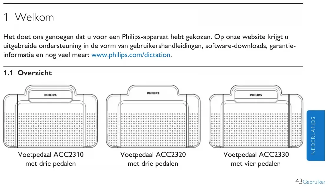 2 343Gebruikershandleiding NEDERLANDS 1 Welkom Het doet ons genoegen dat u voor een Philips-apparaat hebt gekozen. Op onze website krijgt u uitgebreide ondersteuning in de vorm van gebruikershandleidingen, software-downloads, garantie- informatie en nog veel meer: www.philips.com/dictation.