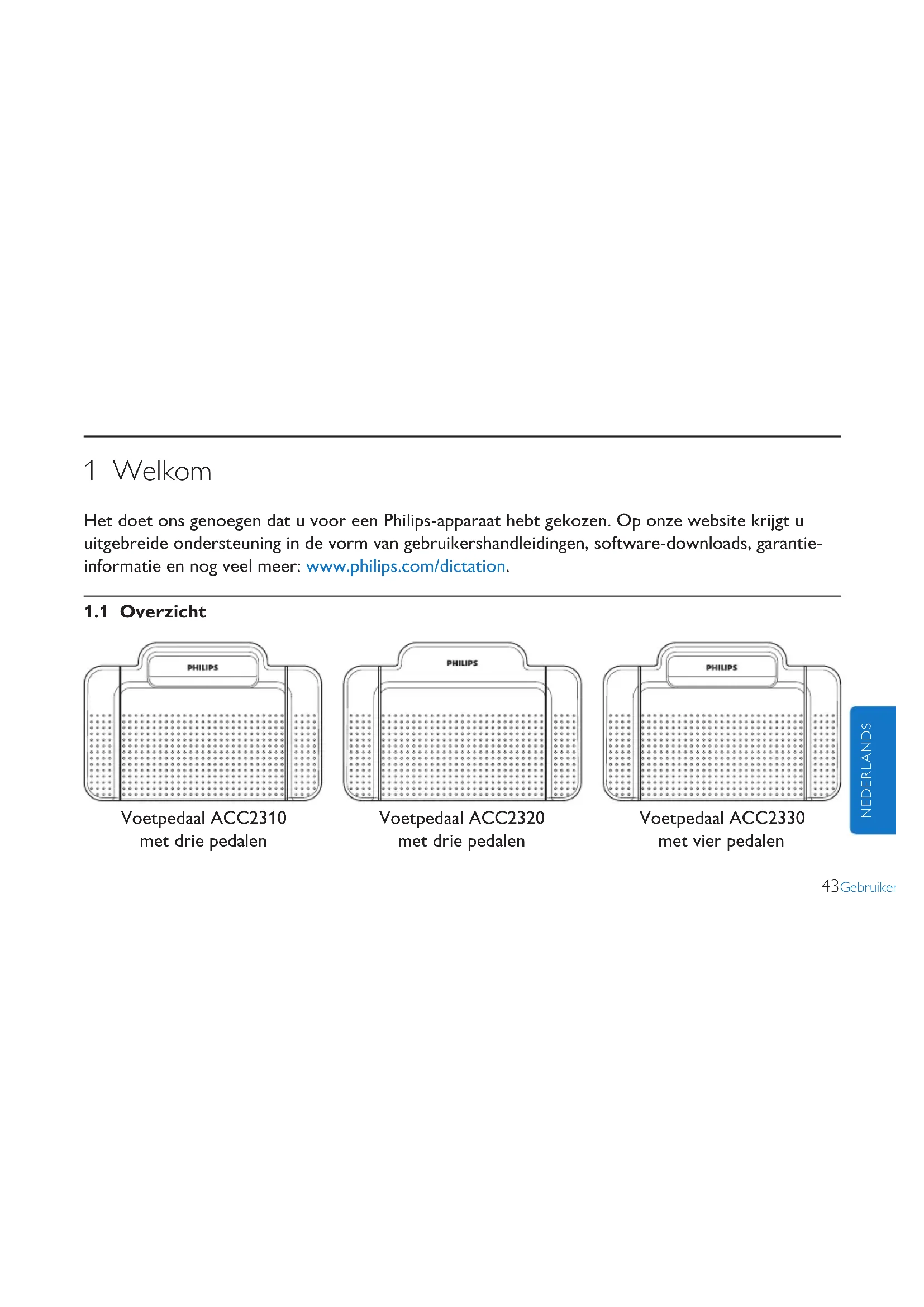 2 343Gebruikershandleiding NEDERLANDS 1 Welkom Het doet ons genoegen dat u voor een Philips-apparaat hebt gekozen. Op onze website krijgt u uitgebreide ondersteuning in de vorm van gebruikershandleidingen, software-downloads, garantie- informatie en nog veel meer: www.philips.com/dictation.