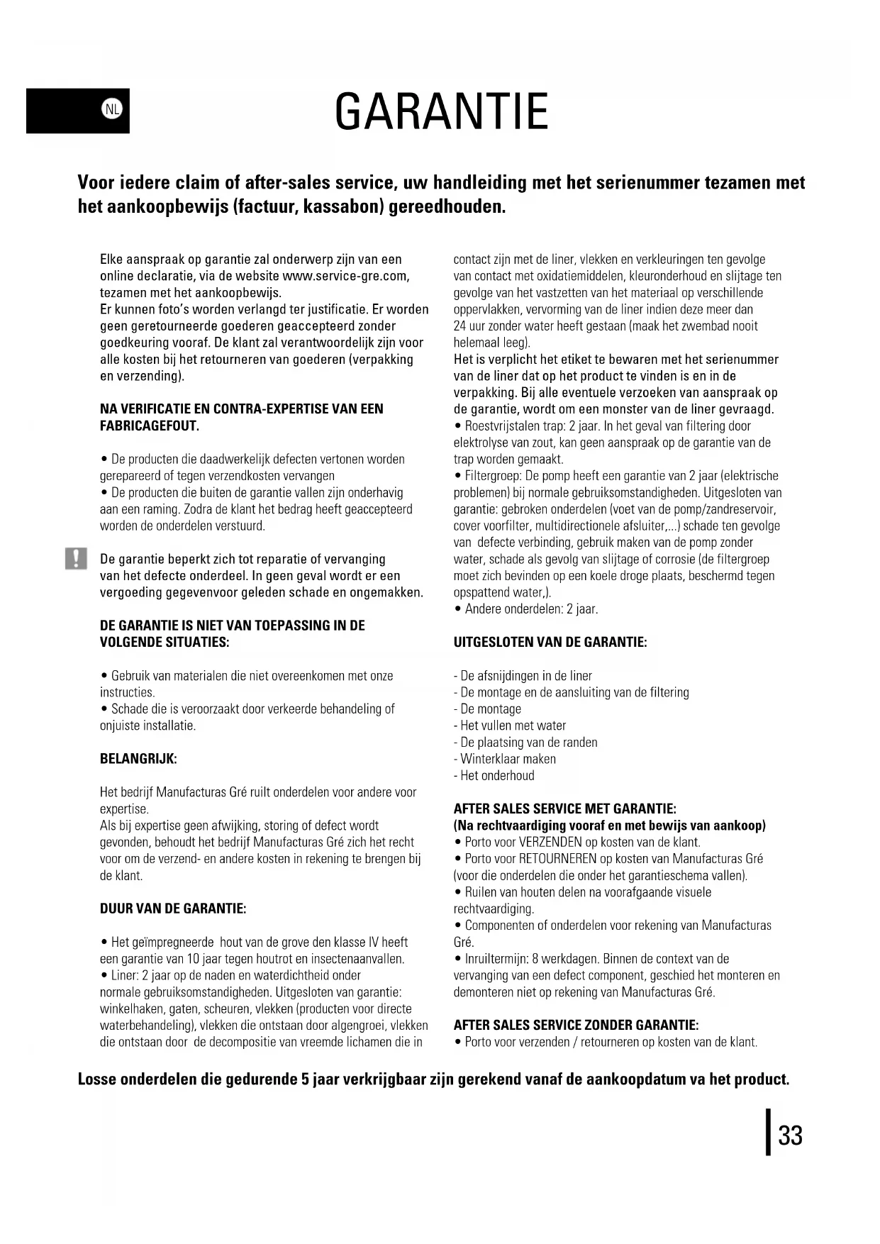 - Andere onderdelen: 2 jaar. UITGESLOTEN VAN DE GARANTIE: - De afsnijdingen in de liner - De montage en de aansluiting van de filtering - De montage - Het vullen met water - De plaatsing van de randen - Winterklaar maken - Het onderhoud AFTER SALES SERVICE MET GARANTIE: (Na rechtvaardiging vooraf en met bewijs van aankoop)