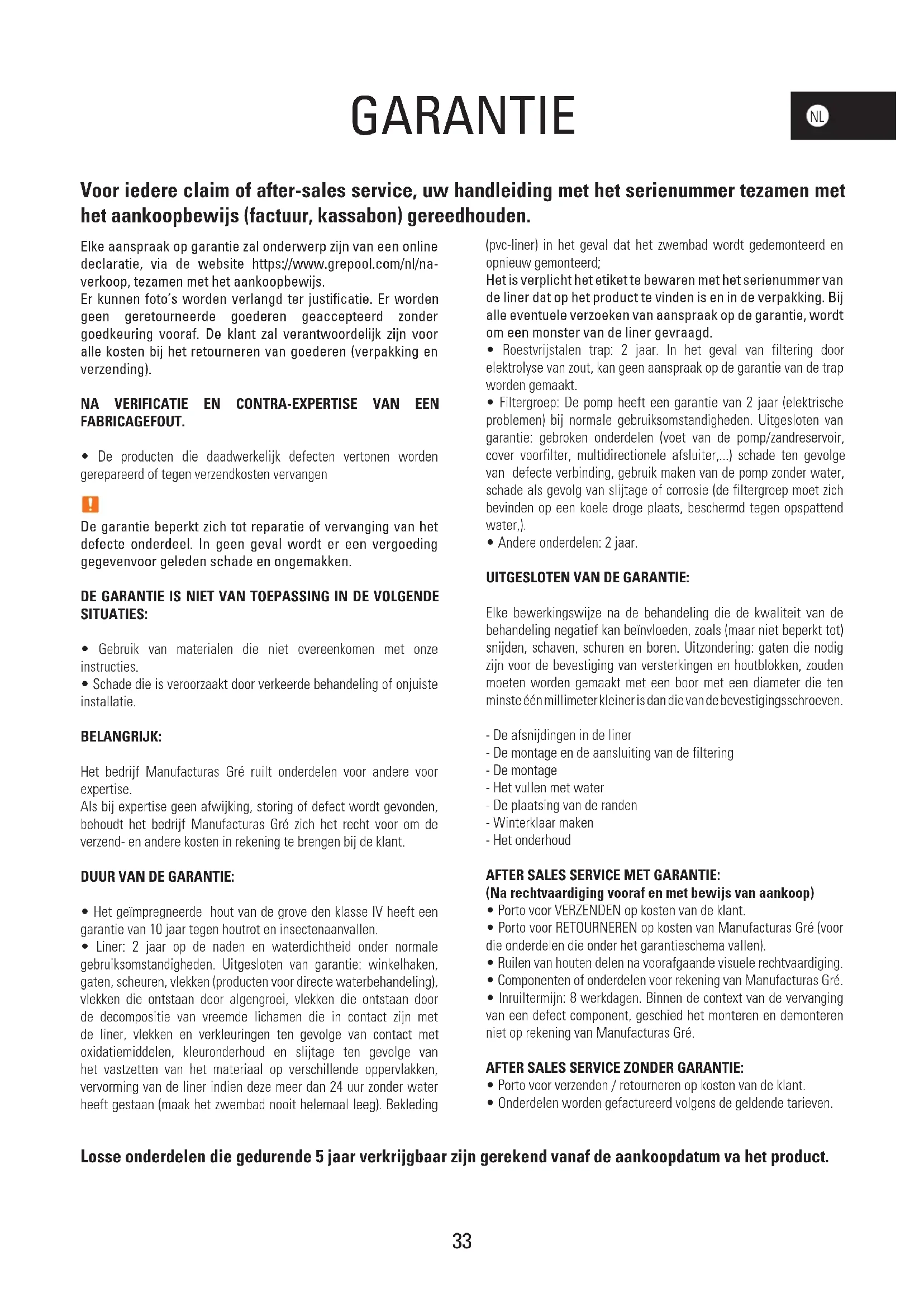 GARANTIE Voor iedere claim of after-sales service, uw handleiding met het serienummer tezamen met het aankoopbewijs (factuur, kassabon) gereedhouden. Losse onderdelen die gedurende 5 jaar verkrijgbaar zijn gerekend vanaf de aankoopdatum va het product. Elke aanspraak op garantie zal onderwerp zijn van een online declaratie, via de website https://www.grepool.com/nl/na- verkoop, tezamen met het aankoopbewijs. Er kunnen foto’s worden verlangd ter justificatie. Er worden geen geretourneerde goederen geaccepteerd zonder goedkeuring vooraf. De klant zal verantwoordelijk zijn voor alle kosten bij het retourneren van goederen (verpakking en verzending).