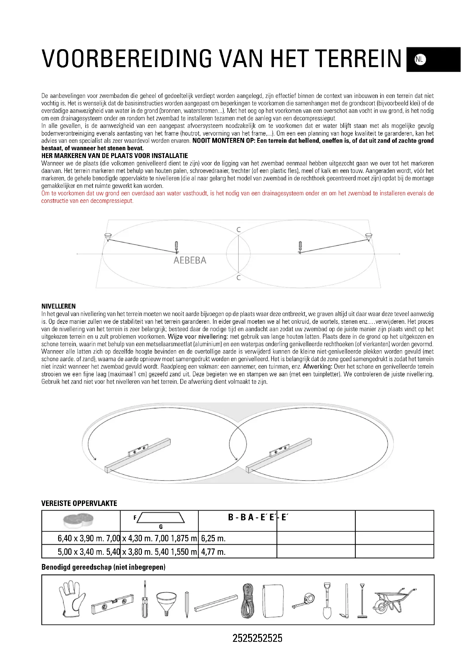 De aanbevelingen voor zwembaden die geheel of gedeeltelijk verdiept worden aangelegd, zijn effectief binnen de context van inbouwen in een terrein dat niet vochtig is. Het is wenselijk dat de basisinstructies worden aangepast om beperkingen te voorkomen die samenhangen met de grondsoort (bijvoorbeeld klei) of de overdadige aanwezigheid van water in de grond (bronnen, waterstromen...). Met het oog op het voorkomen van een overschot aan vocht in uw grond, is het nodig om een drainagesysteem onder en rondom het zwembad te installeren tezamen met de aanleg van een decompressieput. In alle gevallen, is de aanwezigheid van een aangepast afvoersysteem noodzakelijk om te voorkomen dat er water blijft staan met als mogelijke gevolg bodemverontreiniging evenals aantasting van het frame (houtrot, vervorming van het frame,...). Om een een planning van hoge kwaliteit te garanderen, kan het advies van een specialist als zeer waardevol worden ervaren. NOOIT MONTEREN OP: Een terrein dat hellend, oneffen is, of dat uit zand of zachte grond bestaat, of wanneer het stenen bevat.HER MARKEREN VAN DE PLAATS VOOR INSTALLATIE Wanneer we de plaats (die volkomen genivelleerd dient te zijn) voor de ligging van het zwembad eenmaal hebben uitgezocht gaan we over tot het markeren daarvan. Het terrein markeren met behulp van houten palen, schroevedraaier, trechter (of een plastic fles), meel of kalk en een touw. Aangeraden wordt, vóór het markeren, de gehele benodigde oppervlakte te nivelleren (die al naar gelang het model van zwembad in de rechthoek gecentreerd moet zijn) opdat bij de montage gemakkelijker en met ruimte gewerkt kan worden. Om te voorkomen dat uw grond een overdaad aan water vasthoudt, is het nodig van een drainagesysteem onder en om het zwembad te installeren evenals de constructie van een decompressieput.NIVELLEREN In het geval van nivellering van het terrein moeten we nooit aarde bijvoegen op de plaats waar deze ontbreekt, we graven altijd uit daar waar deze teveel aanwezig is. Op deze manier zullen we de stabiliteit van het terrein garanderen. In eider geval moeten we al het onkruid, de wortels, stenen enz.…verwijderen. Het proces van de nivellering van het terrein is zeer belangrijk; besteed daar de nodige tijd en aandacht aan zodat uw zwembad op de juiste manier zijn plaats vindt op het uitgekozen terrein en u zult problemen voorkomen. Wijze voor nivellering: met gebruik van lange houten latten. Plaats deze in de grond op het uitgekozen en schone terrein, waarin met behulp van een metselaarsmeetlat (aluminium) en een waterpas onderling genivelleerde rechthoeken (of vierkanten) worden gevormd. Wanneer alle latten zich op dezelfde hoogte bevinden en de overtollige aarde is verwijderd kunnen de kleine niet-genivelleerde plekken worden gevuld (met schone aarde. of zand), waarna de aarde opnieuw moet samengedrukt worden en genivelleerd. Het is belangrijk dat de zone goed samengedrukt is zodat het terrein niet inzakt wanneer het zwembad gevuld wordt. Raadpleeg een vakman: een aannemer, een tuinman, enz. Afwerking: Over het schone en genivelleerde terrein strooien we een fijne laag (maximaal1 cm) gezeefd zand uit. Deze begieten we en stampen we aan (met een tuinpletter). We controleren de juiste nivellering. Gebruik het zand niet voor het nivelleren van het terrein. De afwerking dient volmaakt te zijn.