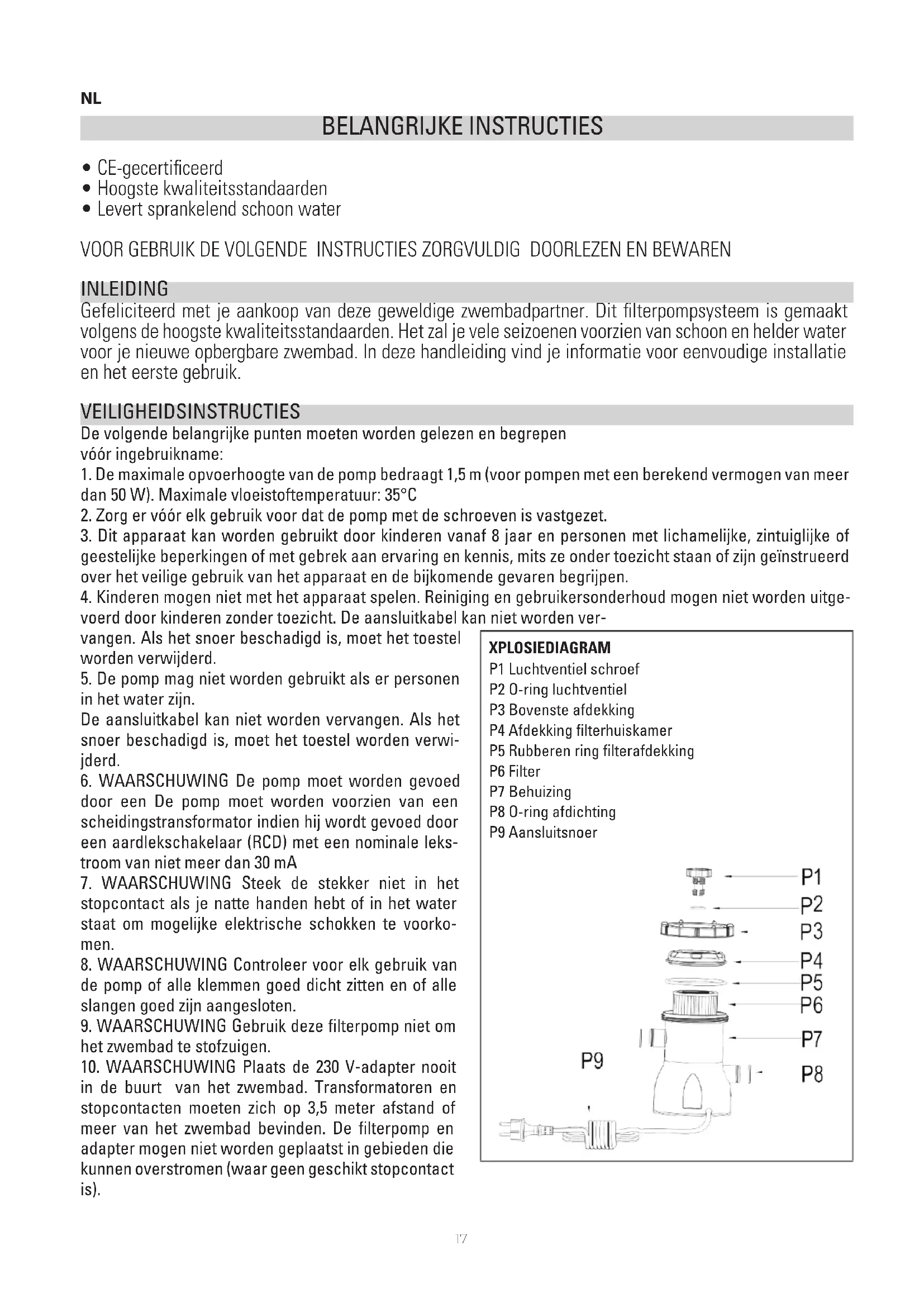 in de buurt van het zwembad. Transformatoren en stopcontacten moeten zich op 3,5 meter afstand of meer van het zwembad bevinden. De filterpomp en adapter mogen niet worden geplaatst in gebieden die kunnen overstromen (waar geen geschikt stopcontact is). XPLOSIEDIAGRAM P1 Luchtventiel schroef P2 O-ring luchtventiel P3 Bovenste afdekking P4 Afdekking filterhuiskamer P5 Rubberen ring filterafdekking P6 Filter P7 Behuizing P8 O-ring afdichting P9 Aansluitsnoer18 INSTALLATIE-INSTRUCTIES