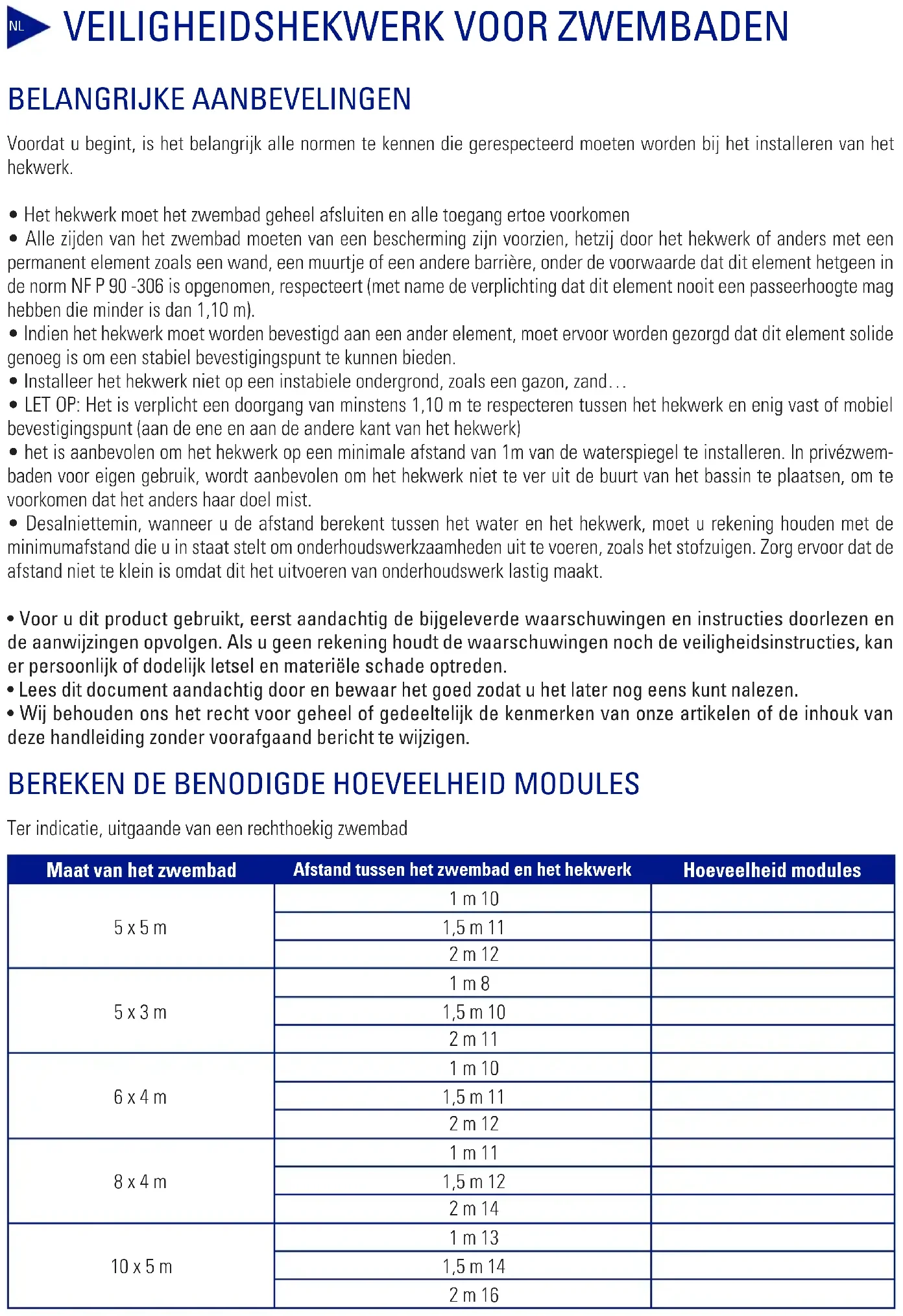 Ter indicatie, uitgaande van een rechthoekig zwembad Maat van het zwembad Afstand tussen het zwembad en het hekwerk Hoeveelheid modules 5 x 5 m 1 m 10 1,5 m 11 2 m 12 5 x 3 m 1 m 8 1,5 m 10 2 m 11 6 x 4 m 1 m 10 1,5 m 11 2 m 12 8 x 4 m 1 m 11 1,5 m 12 2 m 14 10 x 5 m 1 m 13 1,5 m 14 2 m 16BENODIGDE GEREEDSCHAPPEN