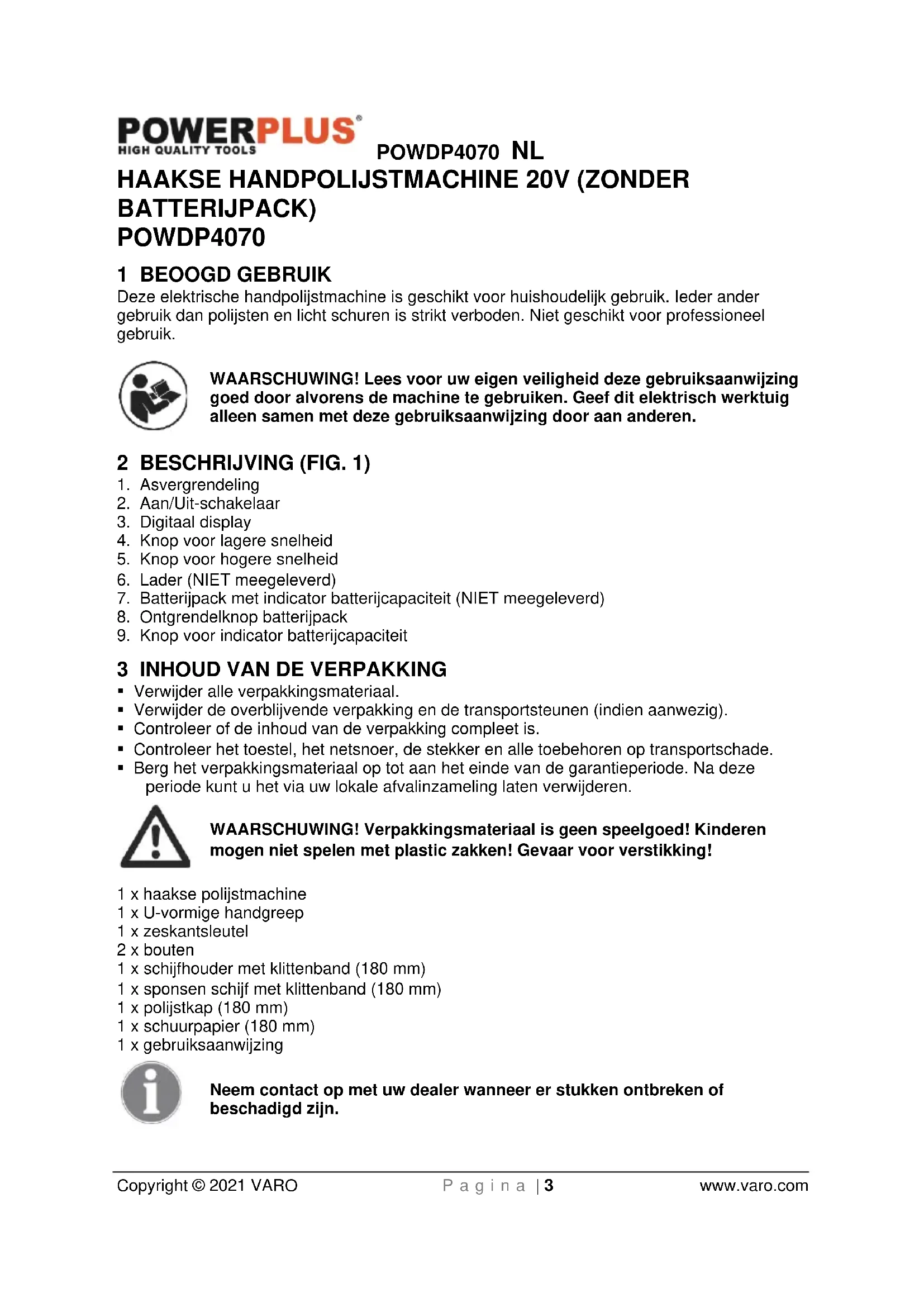 - Berg het verpakkingsmateriaal op tot aan het einde van de garantieperiode. Na deze periode kunt u het via uw lokale afvalinzameling laten verwijderen. WAARSCHUWING! Verpakkingsmateriaal is geen speelgoed! Kinderen mogen niet spelen met plastic zakken! Gevaar voor verstikking! 1 x haakse polijstmachine 1 x U-vormige handgreep 1 x zeskantsleutel 2 x bouten 1 x schijfhouder met klittenband (180 mm) 1 x sponsen schijf met klittenband (180 mm) 1 x polijstkap (180 mm) 1 x schuurpapier (180 mm) 1 x gebruiksaanwijzing Neem contact op met uw dealer wanneer er stukken ontbreken of beschadigd zijn.POWDP4070 NL Copyright © 2021 VARO P a g i n a | 4 www.varo.com