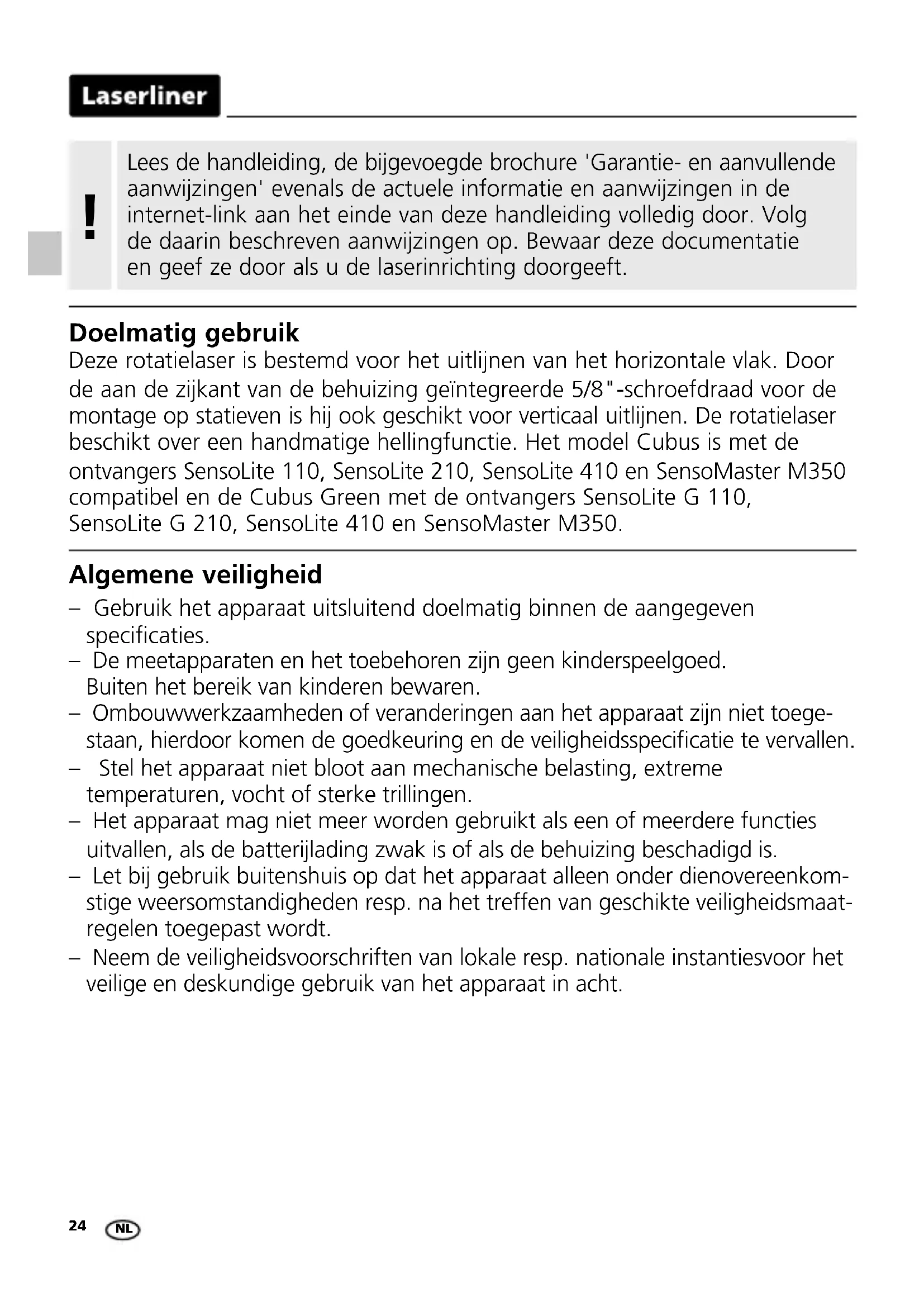 a horizontal reference between points A1 and A2.24 Algemene veiligheid – Gebruik het apparaat uitsluitend doelmatig binnen de aangegeven specicaties. – De meetapparaten en het toebehoren zijn geen kinderspeelgoed. Buiten het bereik van kinderen bewaren. – Ombouwwerkzaamheden of veranderingen aan het apparaat zijn niet toege- staan, hierdoor komen de goedkeuring en de veiligheidsspecicatie te vervallen. – Stel het apparaat niet bloot aan mechanische belasting, extreme temperaturen, vocht of sterke trillingen. – Het apparaat mag niet meer worden gebruikt als een of meerdere functies uitvallen, als de batterijlading zwak is of als de behuizing beschadigd is. – Let bij gebruik buitenshuis op dat het apparaat alleen onder dienovereenkom- stige weersomstandigheden resp. na het treffen van geschikte veiligheidsmaat- regelen toegepast wordt. – Neem de veiligheidsvoorschriften van lokale resp. nationale instantiesvoor het veilige en deskundige gebruik van het apparaat in acht. Doelmatig gebruik Deze rotatielaser is bestemd voor het uitlijnen van het horizontale vlak. Door de aan de zijkant van de behuizing geïntegreerde 5/8"-schroefdraad voor de montage op statieven is hij ook geschikt voor verticaal uitlijnen. De rotatielaser beschikt over een handmatige hellingfunctie. Het model Cubus is met de ontvangers SensoLite 110, SensoLite 210, SensoLite 410 en SensoMaster M350 compatibel en de Cubus Green met de ontvangers SensoLite G 110, SensoLite G 210, SensoLite 410 en SensoMaster M350. Lees de handleiding, de bijgevoegde brochure 'Garantie- en aanvullende aanwijzingen' evenals de actuele informatie en aanwijzingen in de internet-link aan het einde van deze handleiding volledig door. Volg de daarin beschreven aanwijzingen op. Bewaar deze documentatie en geef ze door als u de laserinrichting doorgeeft.
