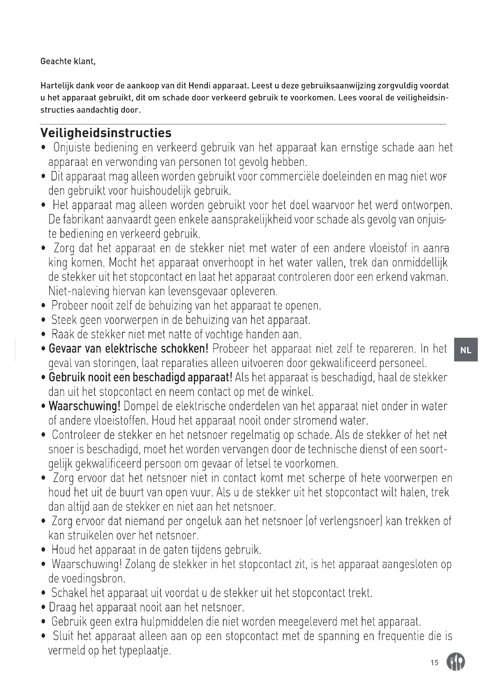 Geachte klant, Hartelijk dank voor de aankoop van dit Hendi apparaat. Leest u deze gebruiksaanwijzing zorgvuldig voordat u het apparaat gebruikt, dit om schade door verkeerd gebruik te voorkomen. Lees vooral de veiligheidsin- structies aandachtig door. Veiligheidsinstructies