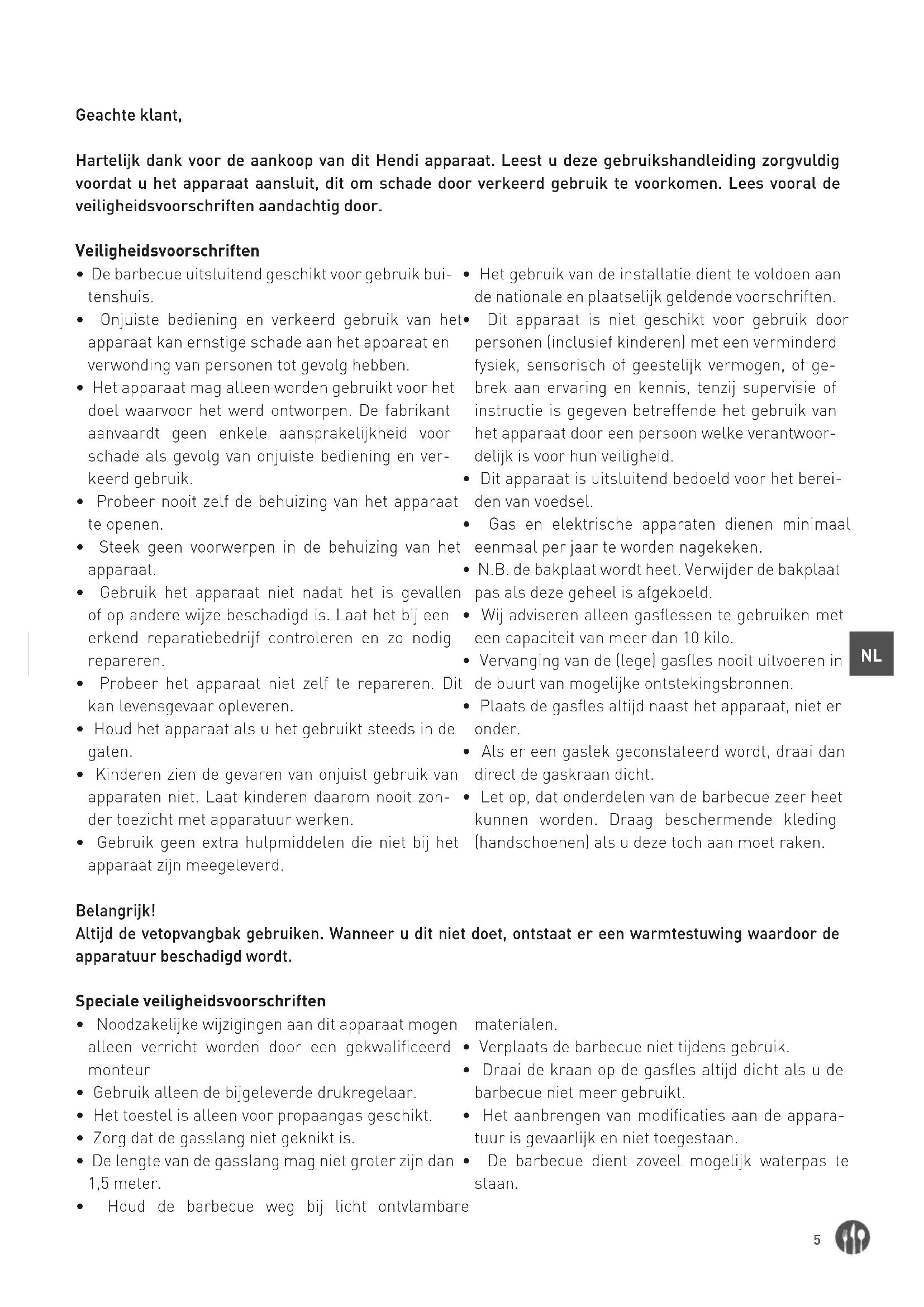 - Let op, dat onderdelen van de barbecue zeer heet kunnen worden. Draag beschermende kleding (handschoenen) als u deze toch aan moet raken. Belangrijk! Altijd de vetopvangbak gebruiken. Wanneer u dit niet doet, ontstaat er een warmtestuwing waardoor de apparatuur beschadigd wordt. Speciale veiligheidsvoorschriften