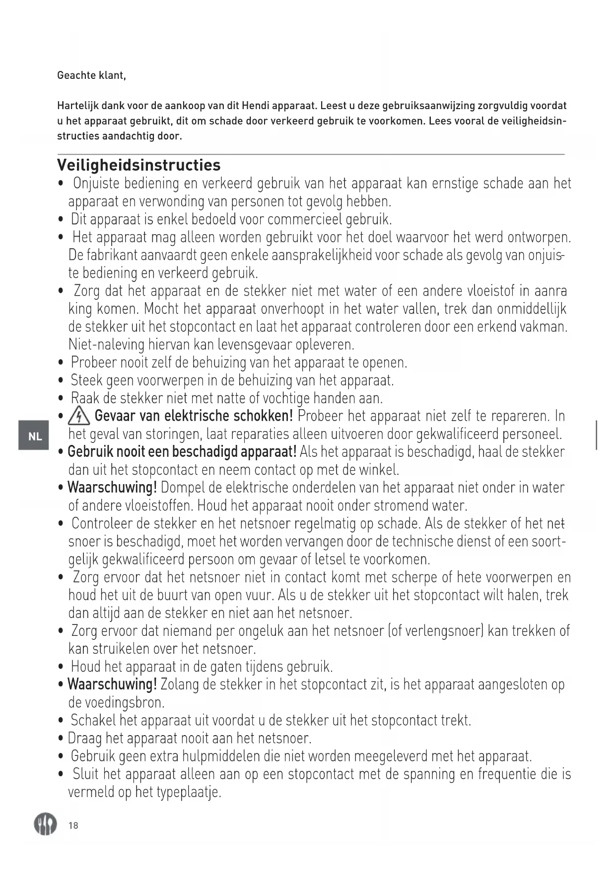 Geachte klant, Hartelijk dank voor de aankoop van dit Hendi apparaat. Leest u deze gebruiksaanwijzing zorgvuldig voordat u het apparaat gebruikt, dit om schade door verkeerd gebruik te voorkomen. Lees vooral de veiligheidsin- structies aandachtig door. Veiligheidsinstructies