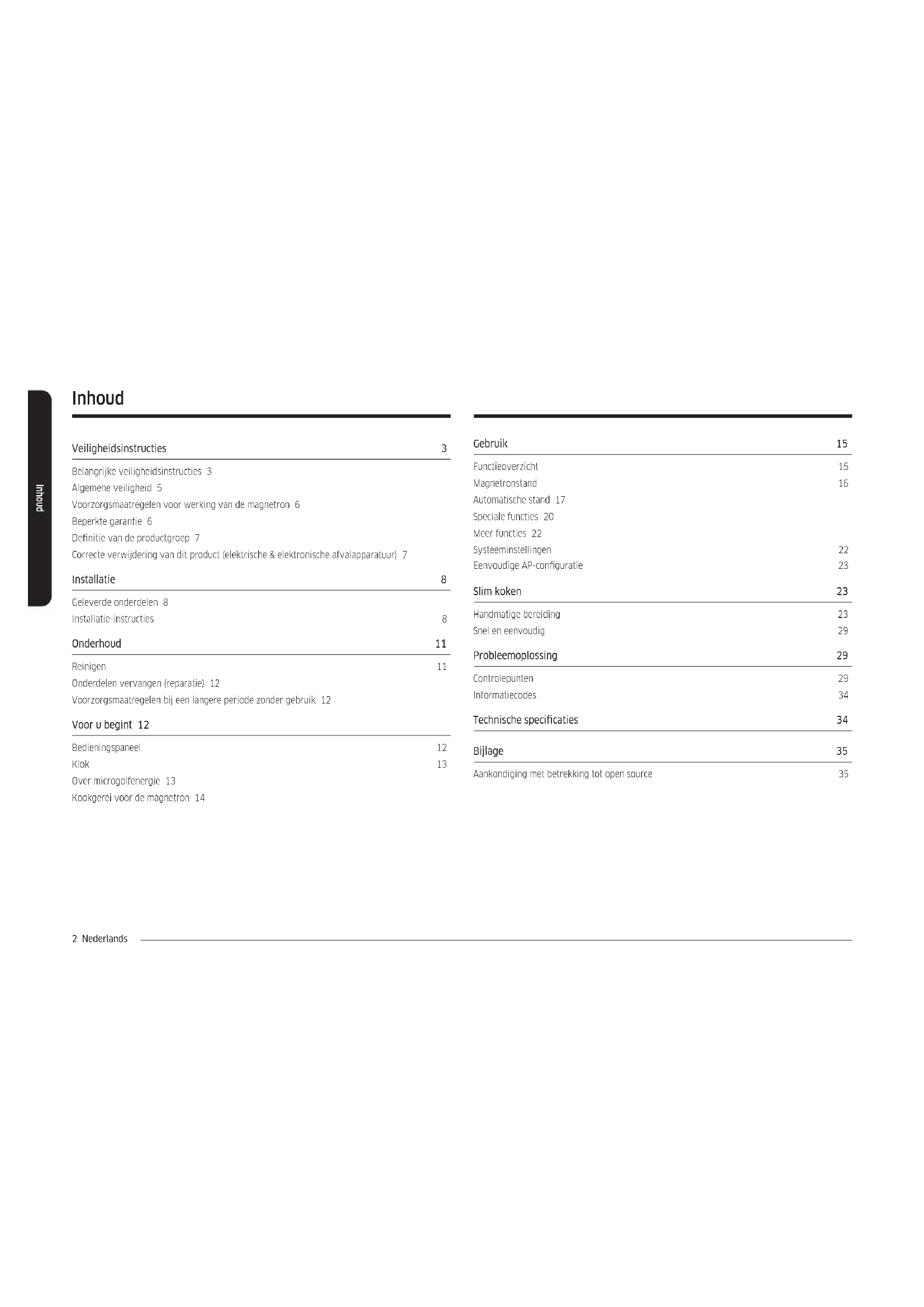Chamada para a rede xa nacional Dias úteis das 9h às 20h www.samsung.com/pt/support SPAIN 91 175 00 15 www.samsung.com/es/support SWEDEN 0771-400 300 www.samsung.com/se/support SWITZERLAND 0800 726 786 www.samsung.com/ch/support (German) www.samsung.com/ch_fr/support (French) UK 0333 000 0333 www.samsung.com/uk/support IRELAND (EIRE) 0818 717100 www.samsung.com/ie/support DG68-01403A-03Magnetronoven Gebruikershandleiding NQ5B5713GB*2 Nederlands Inhoud Inhoud Veiligheidsinstructies 3 Belangrijke veiligheidsinstructies 3 Algemene veiligheid 5 Voorzorgsmaatregelen voor werking van de magnetron 6 Beperkte garantie 6 Denitie van de productgroep 7 Correcte verwijdering van dit product (elektrische & elektronische afvalapparatuur) 7 Installatie 8 Geleverde onderdelen 8 Installatie-instructies 8 Onderhoud 11 Reinigen 11 Onderdelen vervangen (reparatie) 12 Voorzorgsmaatregelen bij een langere periode zonder gebruik 12 Voor u begint 12 Bedieningspaneel 12 Klok 13 Over microgolfenergie 13 Kookgerei voor de magnetron 14 Gebruik 15 Functieoverzicht 15 Magnetronstand 16 Automatische stand 17 Speciale functies 20 Meer functies 22 Systeeminstellingen 22 Eenvoudige AP-conguratie 23 Slim koken 23 Handmatige bereiding 23 Snel en eenvoudig 29 Probleemoplossing 29 Controlepunten 29 Informatiecodes 34 Technische specicaties 34 Bijlage 35 Aankondiging met betrekking tot open source 35Nederlands 3 Veiligheidsinstructies Veiligheidsinstructies BELANGRIJKE VEILIGHEIDSINSTRUCTIES LEES DE AANWIJZINGEN ZORGVULDIG DOOR EN BEWAAR DEZE ZODAT U ZE IN DE TOEKOMST KUNT RAADPLEGEN. WAARSCHUWING: Als de deur of de afsluitstrippen zijn beschadigd, mag u de oven niet gebruiken voordat deze is gerepareerd door een gekwaliceerde monteur. WAARSCHUWING: Onderhoud en reparaties waarbij de behuizing, die bescherming biedt tegen blootstelling aan microgolven, wordt verwijderd, mogen alleen worden uitgevoerd door een gekwaliceerde monteur. Voor anderen is dit levensgevaarlijk. WAARSCHUWING: Vloeistoffen en andere gerechten mogen niet worden verwarmd in een afgesloten verpakking, aangezien deze kan exploderen. WAARSCHUWING: Laat de oven alleen zonder toezicht door kinderen gebruiken nadat u duidelijke instructies hebt gegeven en u ervan overtuigd bent dat het kind in staat is de oven op een veilige manier te bedienen en begrijpt wat de gevaren zijn van onjuist gebruik. Dit apparaat is uitsluitend bedoeld voor huishoudelijk gebruik en niet voor:
