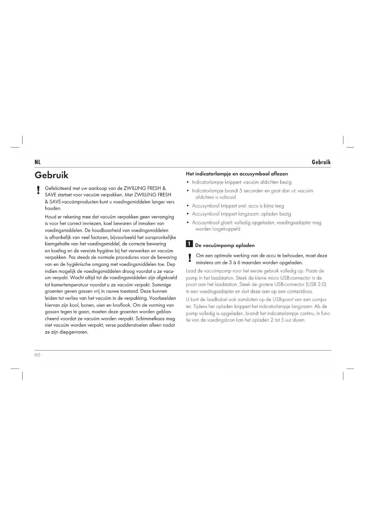 De vacuümpomp opladen Om een optimale werking van de accu te behouden, moet deze minstens om de 3 à 6 maanden worden opgeladen. Laad de vacuümpomp voor het eerste gebruik volledig op. Plaats de pomp in het laadstation. Steek de kleine micro USB-connector in de poort aan het laadstation. Steek de grotere USB-connector (USB 2.0) in eenvoedingsadapter en sluit deze aan op een contactdoos. U kunt de laadkabel ook aansluiten op de USB-poort van een compu- ter. Tijdens het opladen knippert het indicatorlampje langzaam. Alsde pomp volledigis opgeladen, brandt het indicatorlampje continu. Infunc- tie van de voedingsbron kan het opladen 2 tot 5 uur duren. Gebruik Gefeliciteerd met uw aankoop van de ZWILLING FRESH & SAVE startset voor vacuüm verpakken. Met ZWILLING FRESH & SAVE-vacuümproducten kunt u voedingsmiddelen langer vers houden. Houd er rekening mee dat vacuüm verpakken geen vervanging is voor het correct invriezen, koel bewaren of inmaken van voedingsmiddelen. De houdbaarheid van voedingsmiddelen isafhankelijk van veel factoren, bijvoorbeeld het oorspronkelijke kiemgehalte van het voedingsmiddel, de correcte bewaring enkoeling en de vereiste hygiëne bij het verwerken en vacuüm verpakken. Pas steeds de normale procedures voor de bewaring van en de hygiënische omgang met voedingsmiddelen toe. Dep indien mogelijk de voedingsmiddelen droog voordat u ze vacu- um verpakt. Wacht altijd tot de voedingsmiddelen zijn afgekoeld tot kamertemperatuur voordat u ze vacuüm verpakt. Sommige groenten geven gassen vrij in rauwe toestand. Deze kunnen leiden tot verlies van het vacuüm in de verpakking. Voorbeelden hiervan zijn kool, bonen, uien en knoflook. Om de vorming van gassen tegen te gaan, moeten deze groenten worden geblan- cheerd voordat ze vacuüm worden verpakt. Schimmelkaas mag niet vacuüm worden verpakt; verse paddenstoelen alleen nadat ze zijn diepgevroren.www.zwilling.com