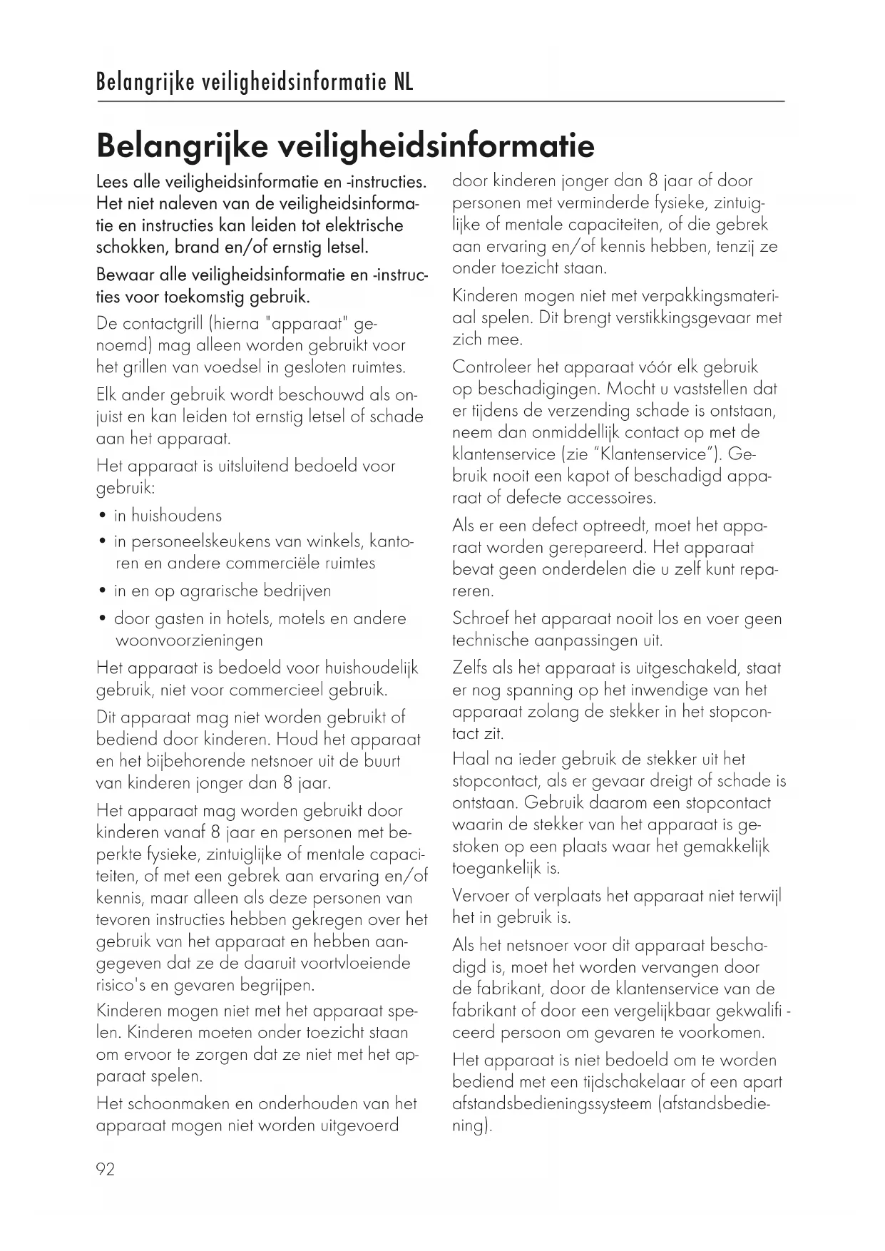 - door gasten in hotels, motels en andere woonvoorzieningen Het apparaat is bedoeld voor huishoudelijk gebruik, niet voor commercieel gebruik. Dit apparaat mag niet worden gebruikt of bediend door kinderen. Houd het apparaat en het bijbehorende netsnoer uit de buurt van kinderen jonger dan 8 jaar. Het apparaat mag worden gebruikt door kinderen vanaf 8 jaar en personen met be- perkte fysieke, zintuiglijke of mentale capaci- teiten, of met een gebrek aan ervaring en/of kennis, maar alleen als deze personen van tevoren instructies hebben gekregen over het gebruik van het apparaat en hebben aan- gegeven dat ze de daaruit voortvloeiende risico's en gevaren begrijpen. Kinderen mogen niet met het apparaat spe- len. Kinderen moeten onder toezicht staan om ervoor te zorgen dat ze niet met het ap- paraat spelen. Het schoonmaken en onderhouden van het apparaat mogen niet worden uitgevoerd Belangrijke veiligheidsinformatie door kinderen jonger dan 8 jaar of door personen met verminderde fysieke, zintuig- lijke of mentale capaciteiten, of die gebrek aan ervaring en/of kennis hebben, tenzij ze onder toezicht staan. Kinderen mogen niet met verpakkingsmateri- aal spelen. Dit brengt verstikkingsgevaar met zich mee. Controleer het apparaat vóór elk gebruik op beschadigingen. Mocht u vaststellen dat er tijdens de verzending schade is ontstaan, neem dan onmiddellijk contact op met de klantenservice (zie “Klantenservice”). Ge- bruik nooit een kapot of beschadigd appa- raat of defecte accessoires. Als er een defect optreedt, moet het appa- raat worden gerepareerd. Het apparaat bevat geen onderdelen die u zelf kunt repa- reren. Schroef het apparaat nooit los en voer geen technische aanpassingen uit. Zelfs als het apparaat is uitgeschakeld, staat er nog spanning op het inwendige van het apparaat zolang de stekker in het stopcon- tact zit. Haal na ieder gebruik de stekker uit het stopcontact, als er gevaar dreigt of schade is ontstaan. Gebruik daarom een stopcontact waarin de stekker van het apparaat is ge- stoken op een plaats waar het gemakkelijk toegankelijk is. Vervoer of verplaats het apparaat niet terwijl het in gebruik is. Als het netsnoer voor dit apparaat bescha- digd is, moet het worden vervangen door de fabrikant, door de klantenservice van de fabrikant of door een vergelijkbaar gekwalifi - ceerd persoon om gevaren te voorkomen. Het apparaat is niet bedoeld om te worden bediend met een tijdschakelaar of een apart afstandsbedieningssysteem (afstandsbedie- ning). NL93 Belangrijke veiligheidsinformatie NL Gebruik het apparaat alleen als de span- ning die op het typeplaatje staat aangege- ven overeenkomt met de spanning van uw stopcontact. Plaats het apparaat op een droge, vlakke en slipvrije ondergrond. Plaats het apparaat niet op een heet opper- vlak of in de buurt van hittebronnen. Gebruik het apparaat niet buitenshuis of in ruimtes met een hoge luchtvochtigheid. Gebruik het apparaat niet in kasten. Gebruik het apparaat nooit zonder grill- plaat. Voedsel om te grillen kan verbranden. Ge- bruik het apparaat nooit in de buurt van of onder brandbare materialen (bijv. gordijnen of overgordijnen, muurkasten). De ruimte boven het apparaat moet altijd vrij en onbe- lemmerd zijn. Gebruik het apparaat nooit in de buurt van brandbare materialen die gemakkelijk kun- nen ontbranden, b.v. benzine of alcohol. Plaats het apparaat niet op oppervlakken die gemakkelijk kunnen ontbranden (bijv. papieren servetten). De oppervlakken van het apparaat kunnen erg heet worden. Gebruik altijd de hand- greep of, indien nodig, hittebestendige doe- ken of handschoenen. Het buitenoppervlak van het apparaat kan erg heet worden terwijl het apparaat in werking is. Gebruik altijd de handgreep of, indien nodig, ovenwanten. Haal de stekker uit het stopcontact als u niet op het apparaat let. Laat het apparaat niet onbeheerd achter tijdens het grillen. Schakel het apparaat uit en haal de stekker uit het stopcontact voordat u het apparaat schoonmaakt of er onderhoud aan pleegt. Raak het netsnoer nooit aan met natte han- den. Raak het apparaat niet aan met natte handen wanneer het in werking is of wan- neer het apparaat op een nat oppervlak staat. Wanneer u de stekker uit het stopcontact haalt, trek dan altijd rechtstreeks aan de stekker. Draag het apparaat niet aan het netsnoer. Zorg ervoor dat het netsnoer niet geknikt of bekneld raakt en dat het netsnoer en het ap- paraat niet in contact komen met hittebron- nen (bijv. kookplaten, gaspitten). Laat het netsnoer niet hangen of doorhan- gen. Berg het netsnoer na gebruik op in het kabelcompartiment aan de onderkant van het apparaat. Verwijder of verwissel de grillplaten alleen als het apparaat volledig is afgekoeld. Dompel het apparaat nooit onder in water of andere vloeistoffen, reinig het niet onder stromend water en stop het niet in de vaat- wasser. Giet geen koud water of brandbare vloei- stoffen op de hete grillplaten. Transporteer en maak het apparaat pas schoon als het volledig is afgekoeld. Gebruik geen harde schoonmaakmiddelen om het apparaat schoon te maken, zoals staalwol, en gebruik geen agressieve of schurende schoonmaakmiddelen. Voordat u het apparaat opbergt: Haal de stekker uit het stopcontact en laat het appa- raat volledig afkoelen. Bewaar het apparaat op een koele, droge plaats waar kinderen of huisdieren niet bij kunnen.94 Belangrijke veiligheidsinformatie NL Gebruikte symbolen Lees de gebruiksaanwijzing zorgvuldig door en bewaar deze voor toekomstig gebruik. VOORZICHTIG! Mogelijk risico op ongevallen en letsel, evenals ernstige materiële schade. Risico op brandwonden door hete oppervlakken Gebruik het apparaat niet buitenshuis of in een vochtige omgeving. Beschermingsklasse I Het apparaat voldoet aan de richtlijnen voor CE-markering. Technische gegevens Stroomvoorziening 220-240 V, 50-60 Hz Uitgangsvermogen 2000 W Stand-by-uitgangsvermogen < 0,3 W Gewicht 8,13 kg Beschermingsklasse I Afmetingen 398 x 321 x 150 mm Inhoud Belangrijke veiligheidsinformatie 1 Overzicht