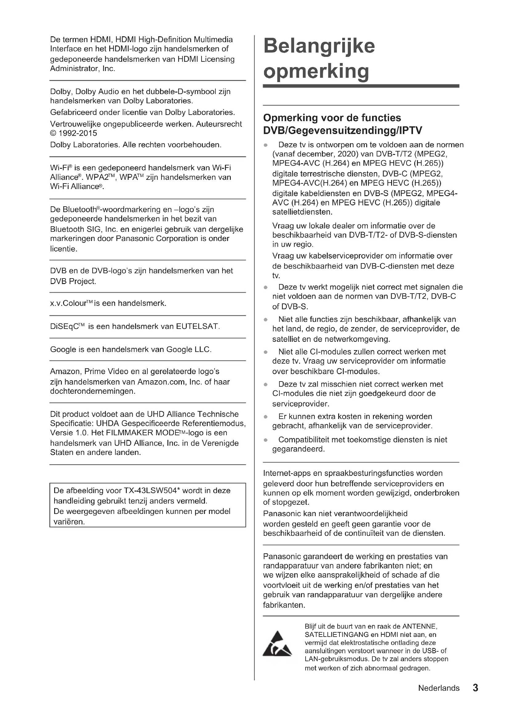 -logo is een handelsmerk van UHD Alliance, Inc. in de Verenigde Staten en andere landen. De afbeelding voor TX-43LSW504* wordt in deze handleiding gebruikt tenzij anders vermeld. De weergegeven afbeeldingen kunnen per model variëren. Belangrijke opmerking Opmerking voor de functies DVB/Gegevensuitzendingg/IPTV ● Deze tv is ontworpen om te voldoen aan de normen (vanaf december, 2020) van DVB-T/T2 (MPEG2, MPEG4-AVC (H.264) en MPEG HEVC (H.265)) digitale terrestrische diensten, DVB-C (MPEG2, MPEG4-AVC(H.264) en MPEG HEVC (H.265)) digitale kabeldiensten en DVB-S (MPEG2, MPEG4- AVC (H.264) en MPEG HEVC (H.265)) digitale satellietdiensten. Vraag uw lokale dealer om informatie over de beschikbaarheid van DVB-T/T2- of DVB-S-diensten in uw regio. Vraag uw kabelserviceprovider om informatie over de beschikbaarheid van DVB-C-diensten met deze tv. ● Deze tv werkt mogelijk niet correct met signalen die niet voldoen aan de normen van DVB-T/T2, DVB-C of DVB-S. ● Niet alle functies zijn beschikbaar, afhankelijk van het land, de regio, de zender, de serviceprovider, de satelliet en de netwerkomgeving. ● Niet alle CI-modules zullen correct werken met deze tv. Vraag uw serviceprovider om informatie over beschikbare CI-modules. ● Deze tv zal misschien niet correct werken met CI-modules die niet zijn goedgekeurd door de serviceprovider. ● Er kunnen extra kosten in rekening worden gebracht, afhankelijk van de serviceprovider. ● Compatibiliteit met toekomstige diensten is niet gegarandeerd. Internet-apps en spraakbesturingsfuncties worden geleverd door hun betreffende serviceproviders en kunnen op elk moment worden gewijzigd, onderbroken of stopgezet. Panasonic kan niet verantwoordelijkheid worden gesteld en geeft geen garantie voor de beschikbaarheid of de continuïteit van de diensten. Panasonic garandeert de werking en prestaties van randapparatuur van andere fabrikanten niet; en we wijzen elke aansprakelijkheid of schade af die voortvloeit uit de werking en/of prestaties van het gebruik van randapparatuur van dergelijke andere fabrikanten. Blijf uit de buurt van en raak de ANTENNE, SATELLIETINGANG en HDMI niet aan, en vermijd dat elektrostatische ontlading deze aansluitingen verstoort wanneer in de USB- of LAN-gebruiksmodus. De tv zal anders stoppen met werken of zich abnormaal gedragen.Nederlands