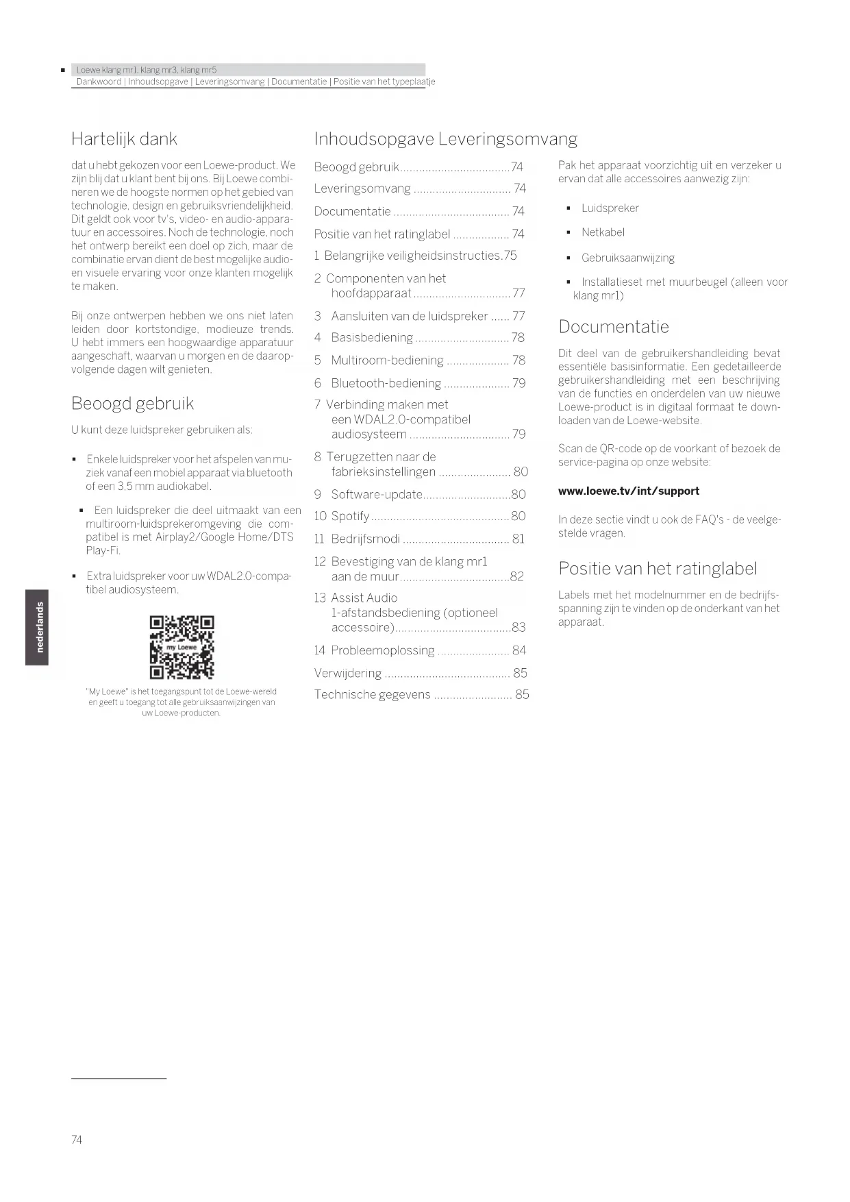 - Loewe klang mr1, klang mr3, klang mr5 italiano portuguêsDankwoord | Inhoudsopgave | Leveringsomvang | Documentatie | Positie van het typeplaatje Hartelijk dank dat u hebt gekozen voor een Loewe-product. We zijn blij dat u klant bent bij ons. Bij Loewe combi- neren we de hoogste normen op het gebied van technologie, design en gebruiksvriendelijkheid. Dit geldt ook voor tv's, video- en audio-appara- tuur en accessoires. Noch de technologie, noch het ontwerp bereikt een doel op zich, maar de combinatie ervan dient de best mogelijke audio- en visuele ervaring voor onze klanten mogelijk te maken. Bij onze ontwerpen hebben we ons niet laten leiden door kortstondige, modieuze trends. U hebt immers een hoogwaardige apparatuur aangeschaft, waarvan u morgen en de daarop- volgende dagen wilt genieten. Beoogd gebruik U kunt deze luidspreker gebruiken als: Enkele luidspreker voor het afspelen van mu- ziek vanaf een mobiel apparaat via bluetooth of een 3,5 mm audiokabel. Een luidspreker die deel uitmaakt van een multiroom-luidsprekeromgeving die com- patibel is met Airplay2/Google Home/DTS Play-Fi. Extra luidspreker voor uw WDAL2.0-compa- tibel audiosysteem. "My Loewe" is het toegangspunt tot de Loewe-wereld en geeft u toegang tot alle gebruiksaanwijzingen van uw Loewe-producten. Inhoudsopgave Leveringsomvang Pak het apparaat voorzichtig uit en verzeker u ervan dat alle accessoires aanwezig zijn: Luidspreker Netkabel Gebruiksaanwijzing Installatieset met muurbeugel (alleen voor klang mr1) Documentatie Dit deel van de gebruikershandleiding bevat essentiële basisinformatie. Een gedetailleerde gebruikershandleiding met een beschrijving van de functies en onderdelen van uw nieuwe Loewe-product is in digitaal formaat te down- loaden van de Loewe-website. Scan de QR-code op de voorkant of bezoek de service-pagina op onze website: www.loewe.tv/int/support In deze sectie vindt u ook de FAQ's - de veelge- stelde vragen. Positie van het ratinglabel Labels met het modelnummer en de bedrijfs- spanning zijn te vinden op de onderkant van het apparaat. Beoogd gebruik p. 74