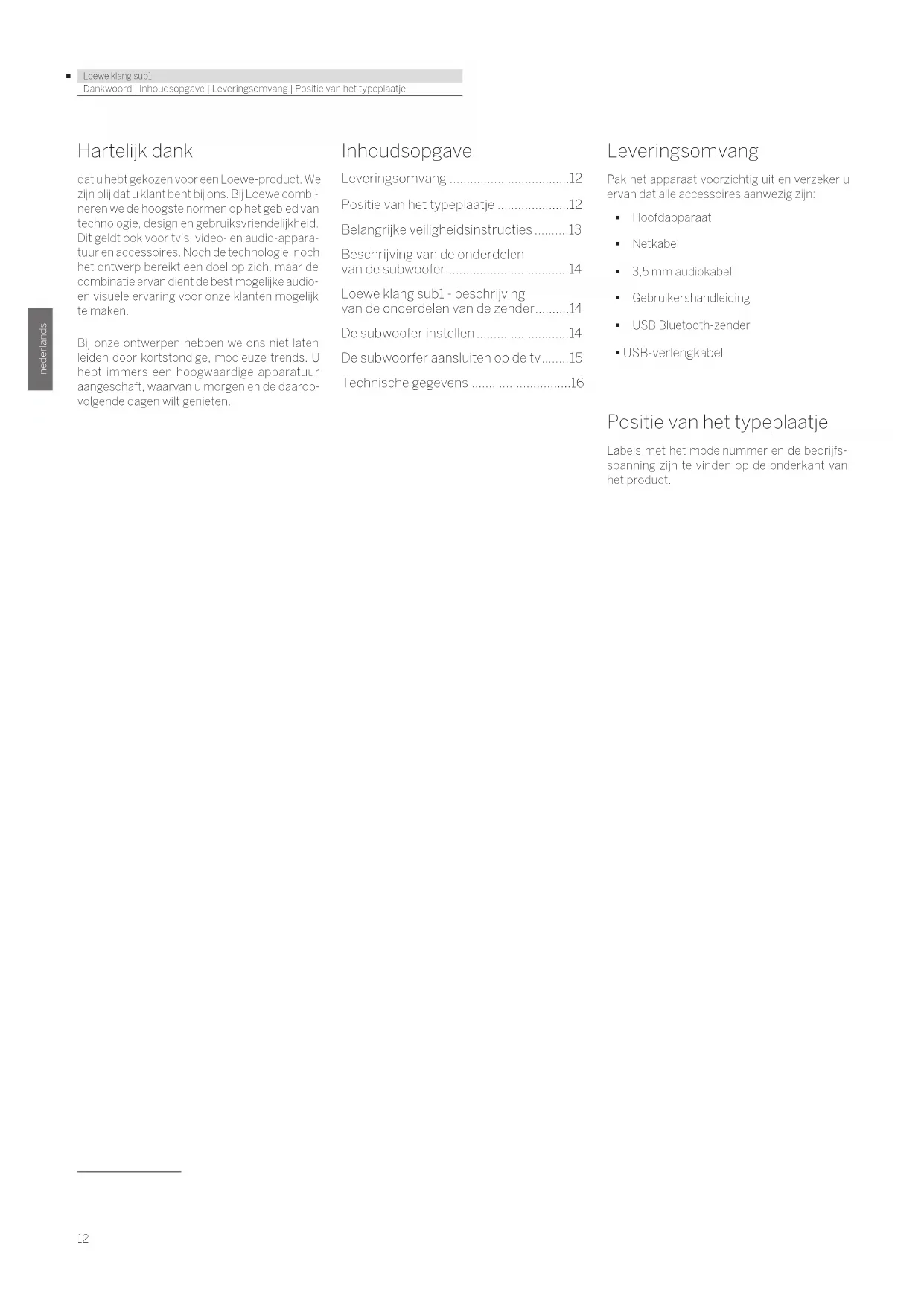 dat u hebt gekozen voor een Loewe-product. We waar bijdat u klant bent bij ons. Bij Loewe combinieren we de hoogste normen op het gebied van technologie, design en gebruksvriendelijkheid. Dit geld ook voor tv's, video- en audio-apparatuur en accessoires. Noch de technologie, noch het ontwerp bereikt een doel op zich, maar de combinatie ervandient de best mogelijkke audioren visuèle ervaring voor onze klanten möglich te makeen.
